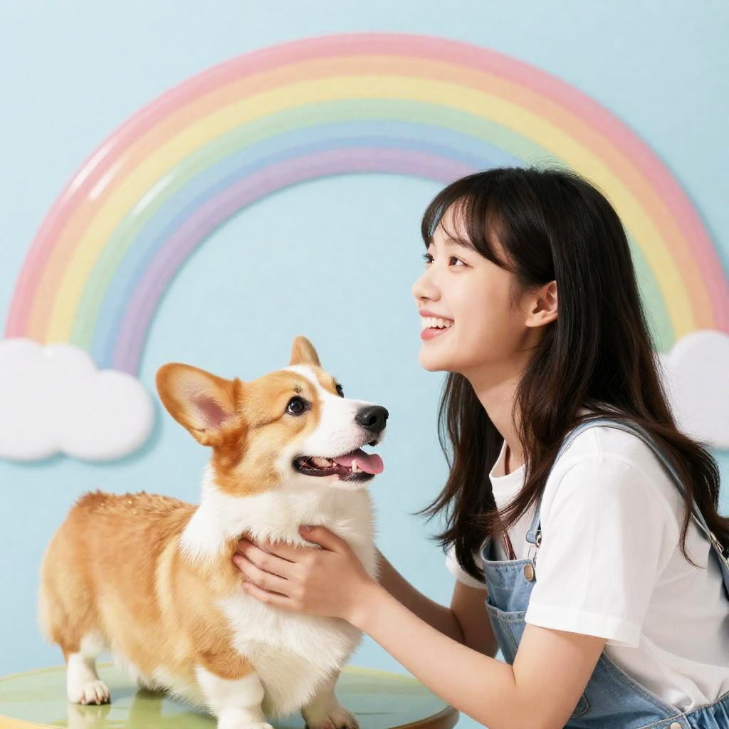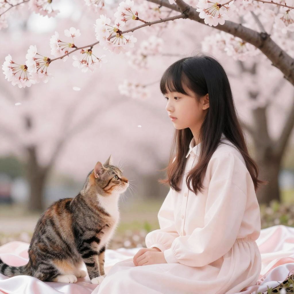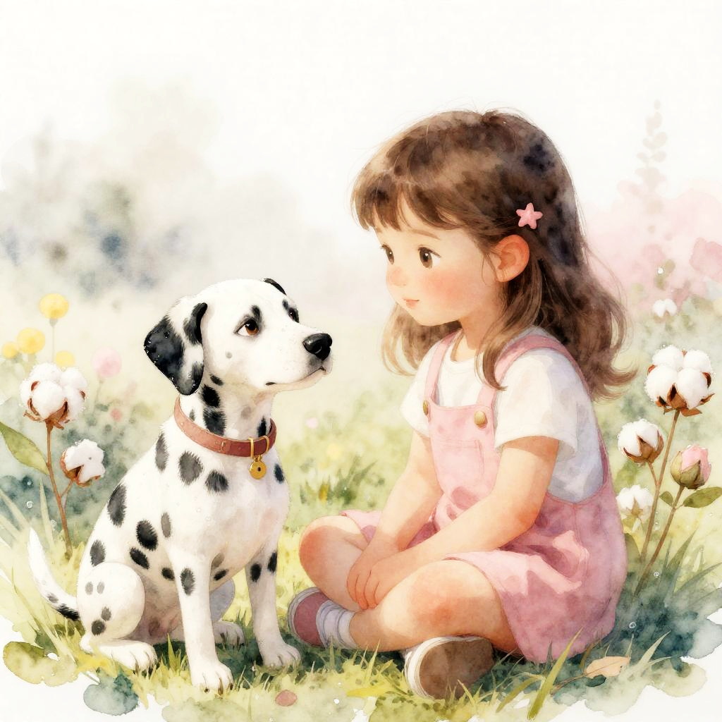 Little girl and her dalmatian gazes wistfully at the morning dew, surrounded by bright pastel hues, in a watercolor style that captures joyful innocence. The scene is enriched with soft cotton textures and features fine line work rendered in 4k quality.