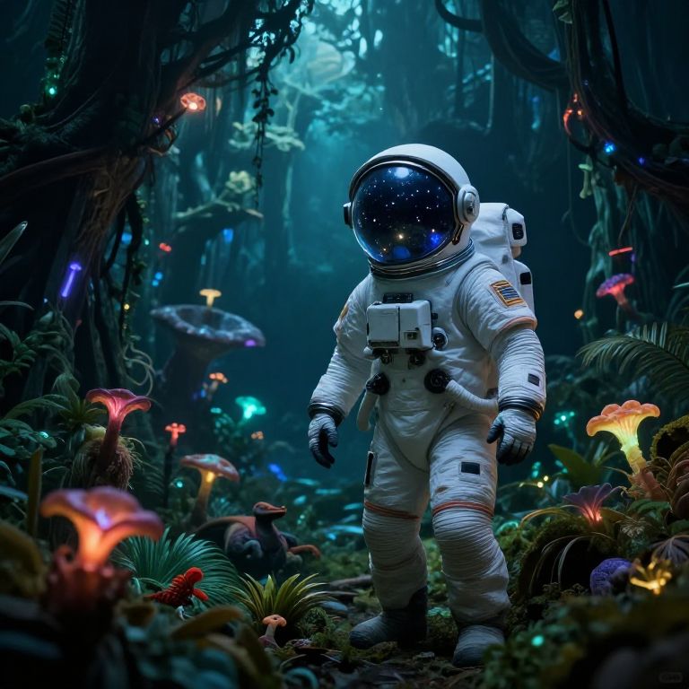 Digital artwork of a space-suited astronaut with a reflective helmet walking through a glowing, bioluminescent forest filled with colorful mushrooms and plants.