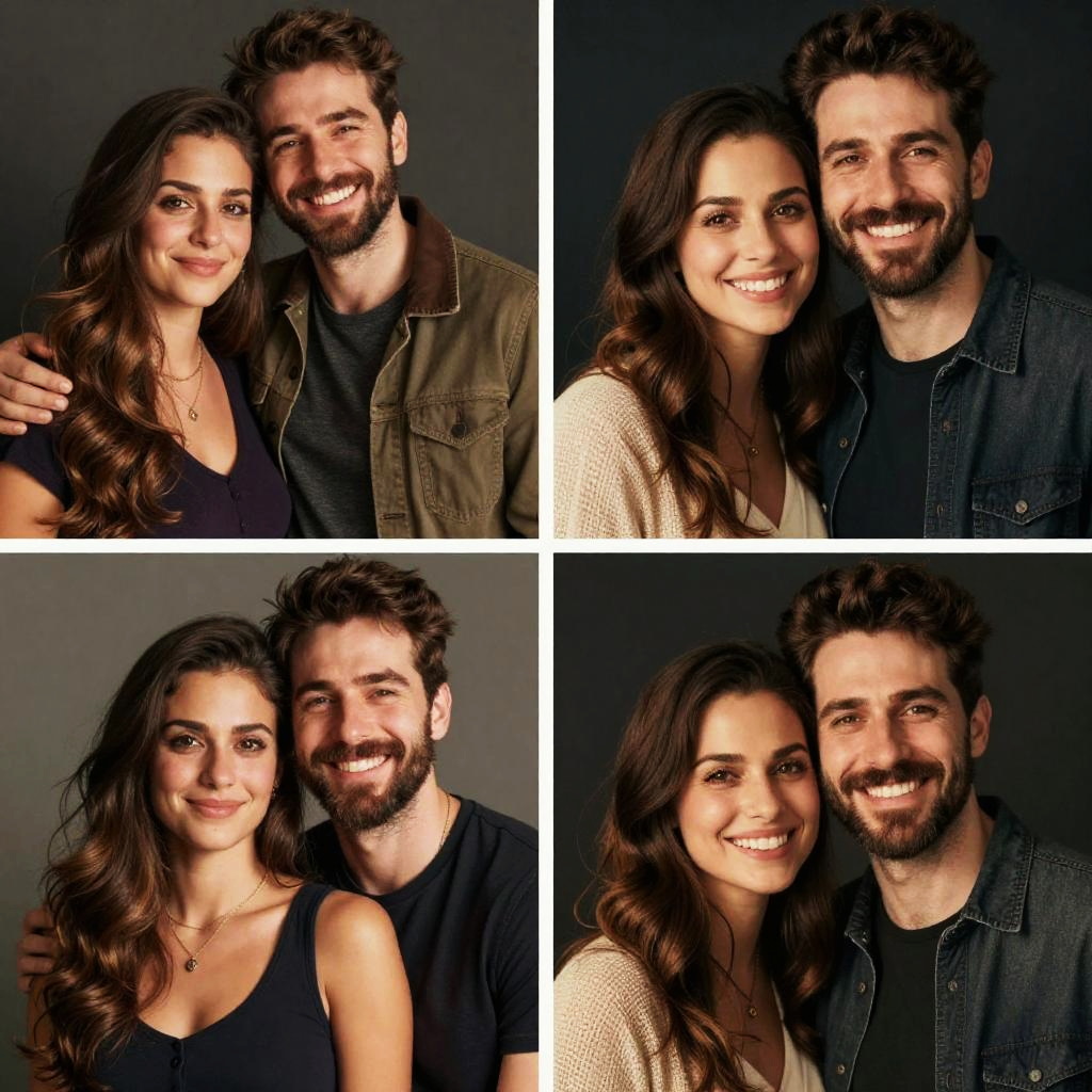 This is a collage of four photographs showing a smiling couple in different poses. The man has dark hair, a beard, and is wearing casual jackets, while the woman has long, wavy brown hair and is dressed in dark and light tops. They are close together, with the man often putting his arm around the woman. The background is dark, making them the focus. The lighting is soft, highlighting their faces.