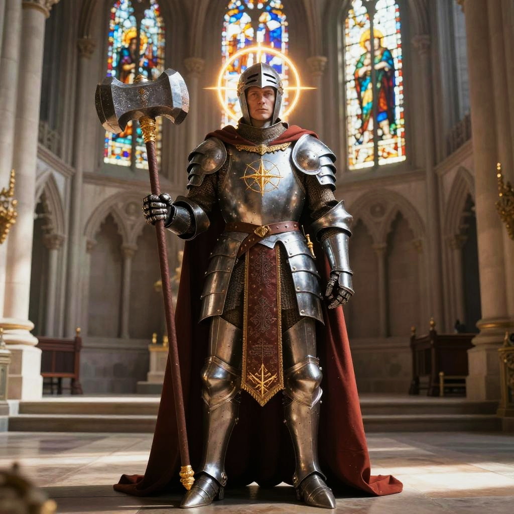 Photorealistic CGI image of a medieval knight standing in a grand, gothic cathedral. The knight, clad in polished silver armor with a red cape, holds a large, ornate hammer in his right hand. He has a metallic helmet with a gold halo-like glow around his head. The background features tall, arched stained glass windows with vibrant colors, casting intricate patterns of light onto the stone floor. The knight's armor is adorned with a gold emblem on his chest. The cathedral's architecture includes tall columns and a wooden altar in the distance. The overall scene exudes a sense of solemnity and grandeur.