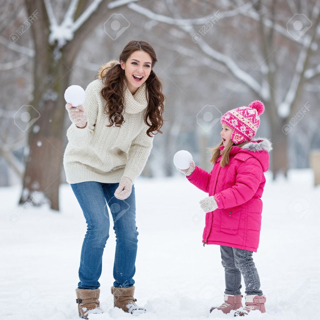 Photograph of a smiling adult woman with long brown hair and a white knitted sweater, and a young girl with brown hair in a red puffer jacket and pink winter hat with white patterns. Both are holding white snowballs and wearing gloves and brown boots. They are standing in a snowy, tree-lined park with blurred, snow-covered trees in the background. The woman is leaning slightly forward, and the girl is standing to the right, both looking at the camera. The scene is brightly lit with a white, snowy ground.