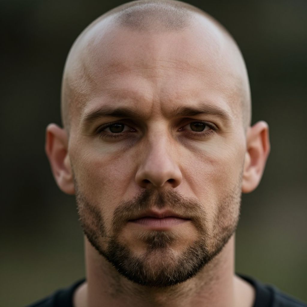 Bald stubble close-up portrait, rugged man with short stubble beard and clean-shaven scalp, intense gaze, soft natural lighting, hyper-realistic style, cinematic background
