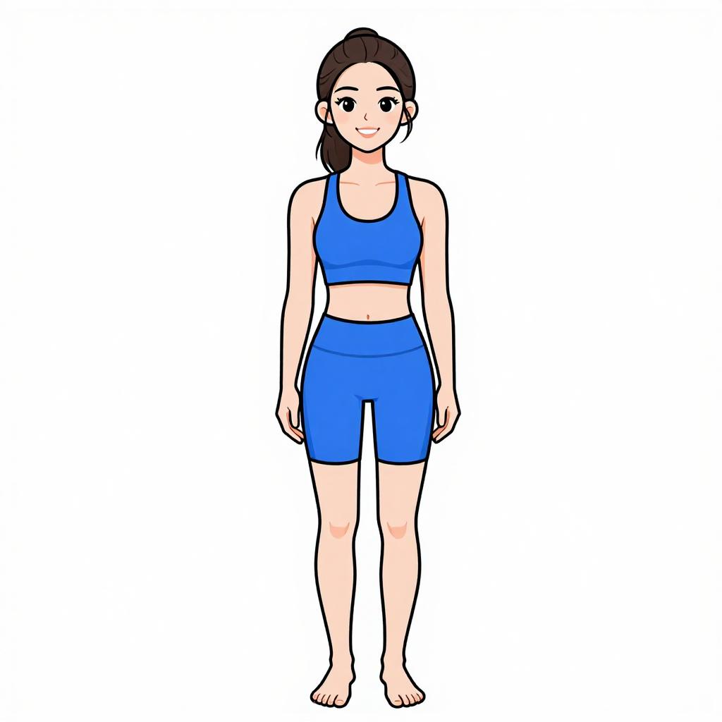 Digital drawing of a young woman with light skin, brown hair in a ponytail, wearing a blue sports bra and shorts, standing barefoot on a
