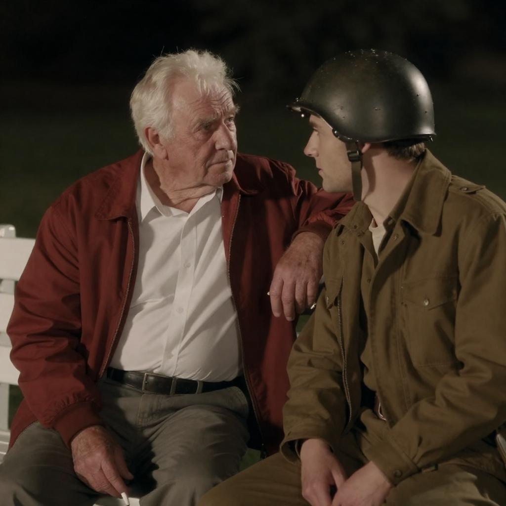 Photograph of an elderly man with white hair in a red jacket and white shirt, holding a cigarette, leaning towards a younger man in a WWII-style helmet and brown jacket, sitting on a white bench at night. Background includes dark, blurred foliage. The elderly man looks intently at the younger man, creating a focused, intimate interaction.