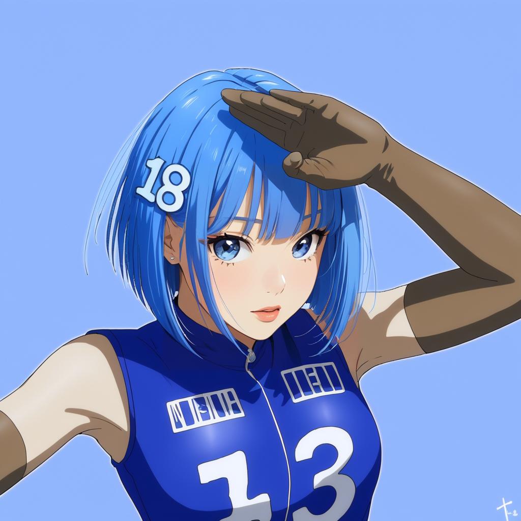 Digital illustration of a young anime girl with short blue bob-cut hair and blue eyes. She is wearing a blue outfit with the numbers '18' and '13' displayed on her hair ornament and torso respectively. The girl is striking a salute pose, wearing long brown elbow gloves against a light blue background. The style resembles that of the artist osashin (osada).