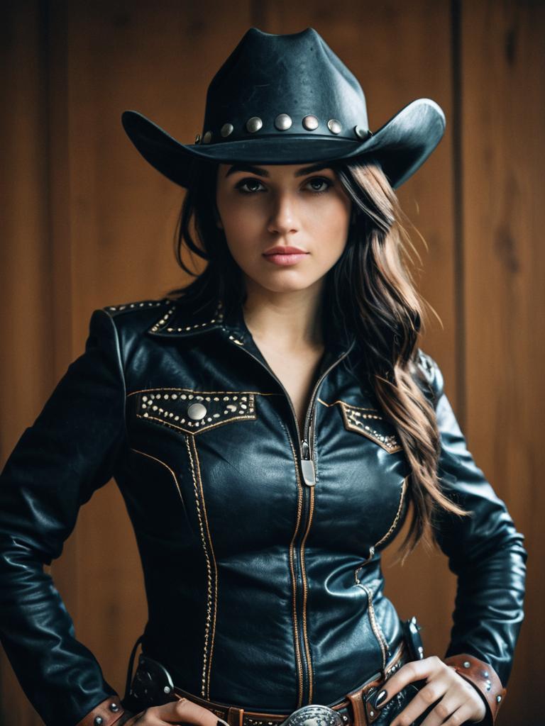 Woman in Leather Cowgirl costume, cosplay editorial photography, photorealistic lighting