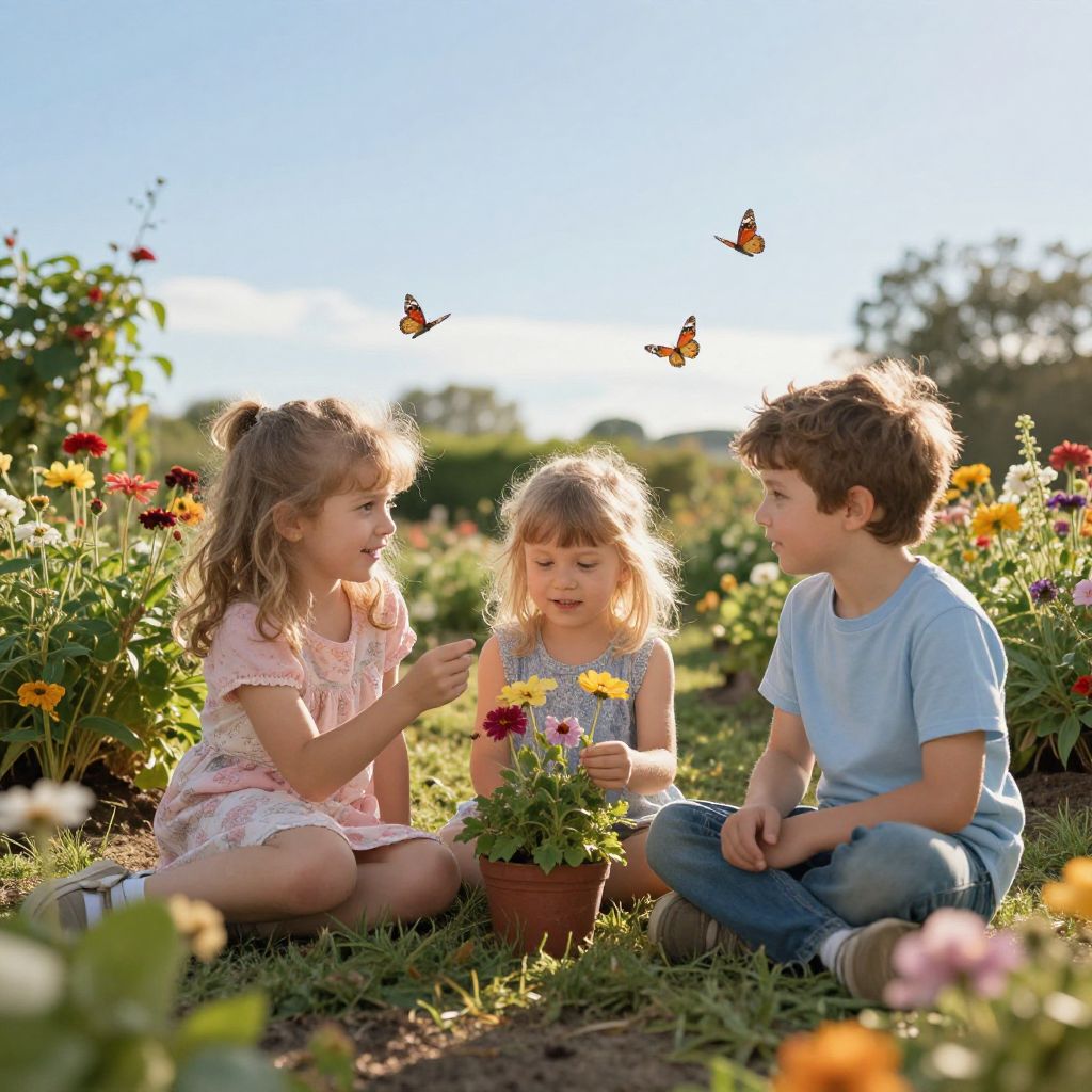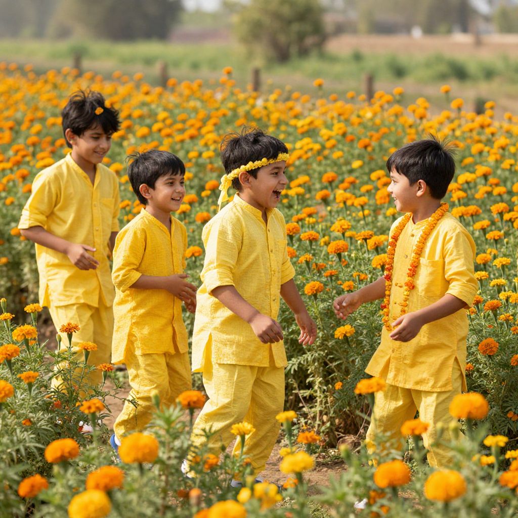 Children dressed in bright saffron clothes playing joyfully in a sunlit field of marigold flowers, vibrant colors blending with the warm natural environment, lively and cheerful atmosphere