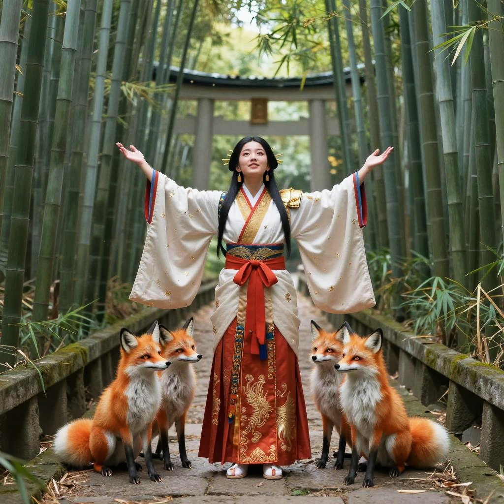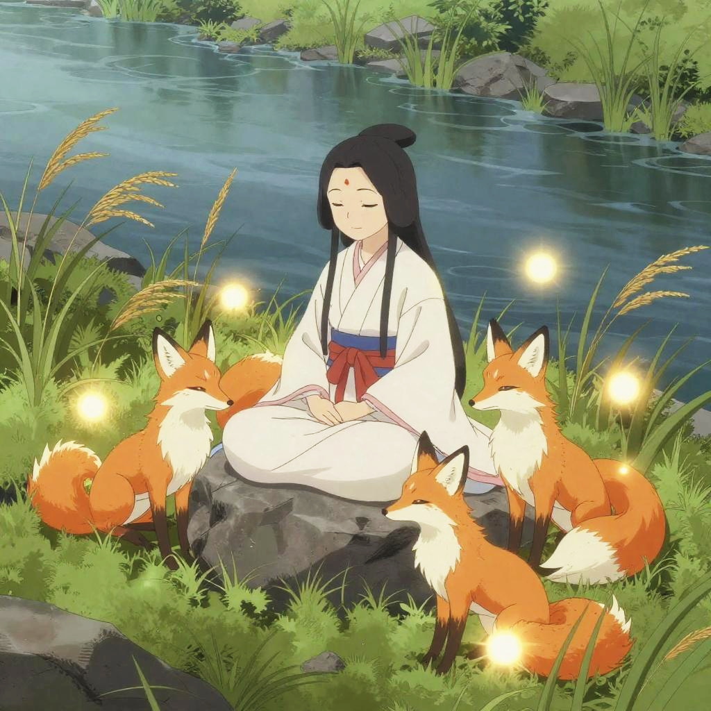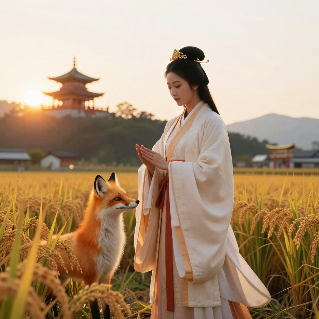 Inari – Deity of rice, prosperity, and foxes, portrayed as a glowing guardian radiating warmth, cradling newborn fox cubs, standing in a secluded cliffside overlooking endless fields of ripening rice plants.