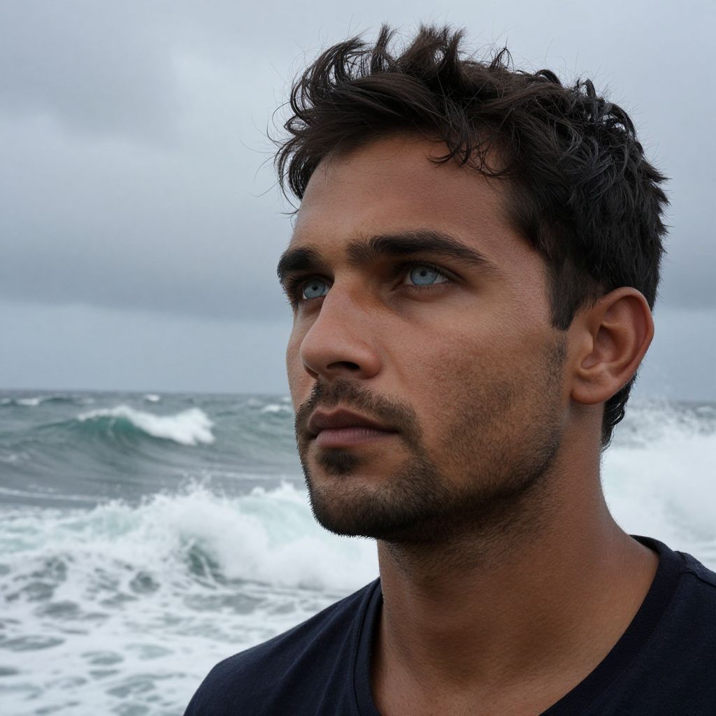 Imagine a strikingly photorealistic portrait of a handsome Nordic man in his early thirties, his piercing azure eyes mirroring the tumultuous seascape behind him. Captured from an intriguing worm's-eye perspective, he exudes pensive contemplation while gazing into the horizon. Soft, diffused lighting accentuates his chiseled features and rugged skin texture, emphasizing a resolute expression. Framed by untamed turbulent grays and violent whites of sea and sky colliding, this image encapsulates the resilience and solitude of a South Asian sailor navigating life's tempestuous waters.