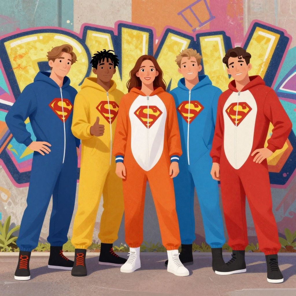 Superhero onesies for adults, a playful and whimsical illustration of friends wearing different themed onesies, standing in front of a colorful graffiti wall, vibrant colors, expressive poses, smooth digital brushwork with subtle texture.