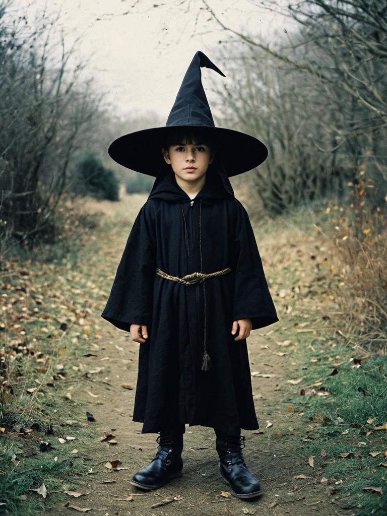 Hung witch costume, hat, solo, witch hat, 1boy, male focus, boots, standing, black headwear, full body, outdoors, robe, black footwear, looking at viewer, closed mouth, long sleeves