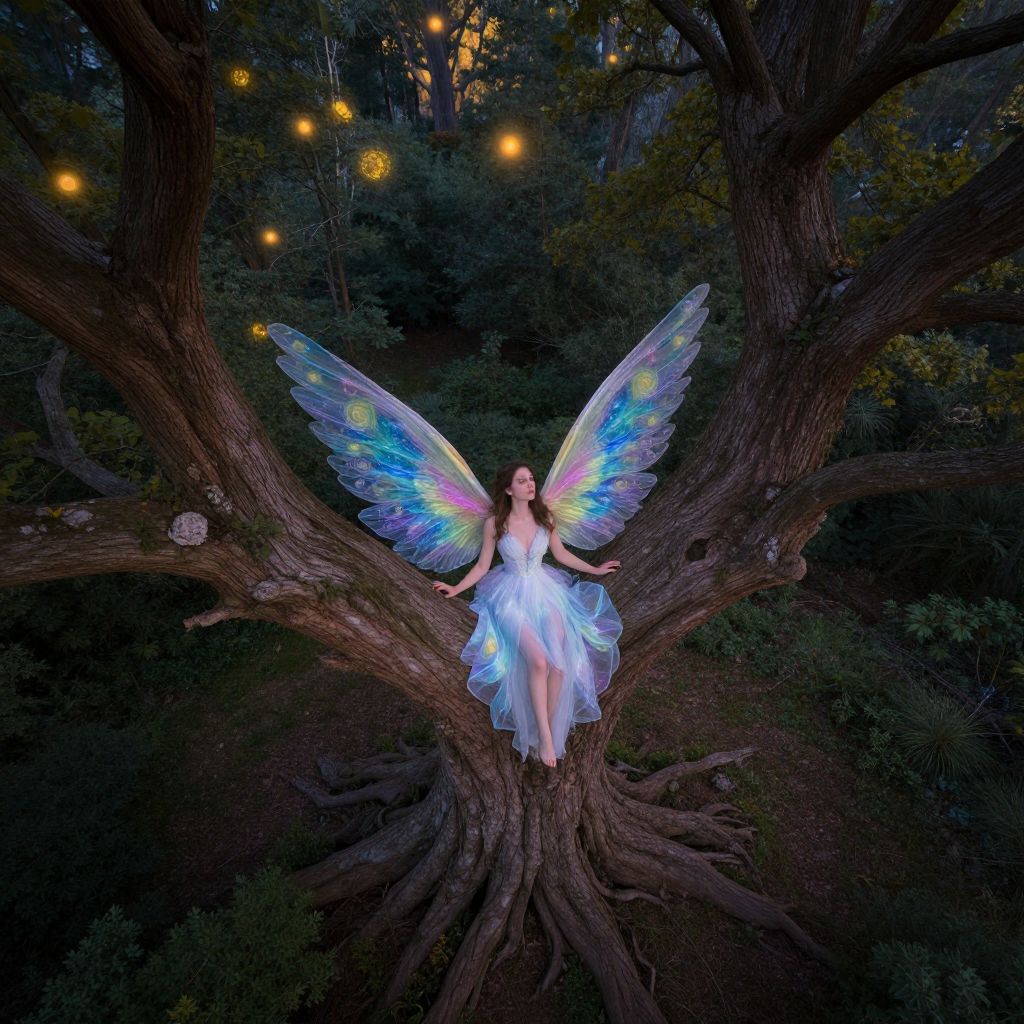Imagine an alluring portrait of a magical woodland sprite with gossamer wings, styled in a dreamlike manner reminiscent of a distinctive blend of fantasy and realism. The scene should be captured from an aerial perspective akin to a 'bug's-eye view' as she elegantly moves among bioluminescent fungi and sparkling fireflies in a mesmerizing twilight setting. This captivating artwork harmoniously merges the ethereal allure of fantasy with the enchanting charm of nature, evoking an emotional spectrum that instills both awe and serenity in the viewer.