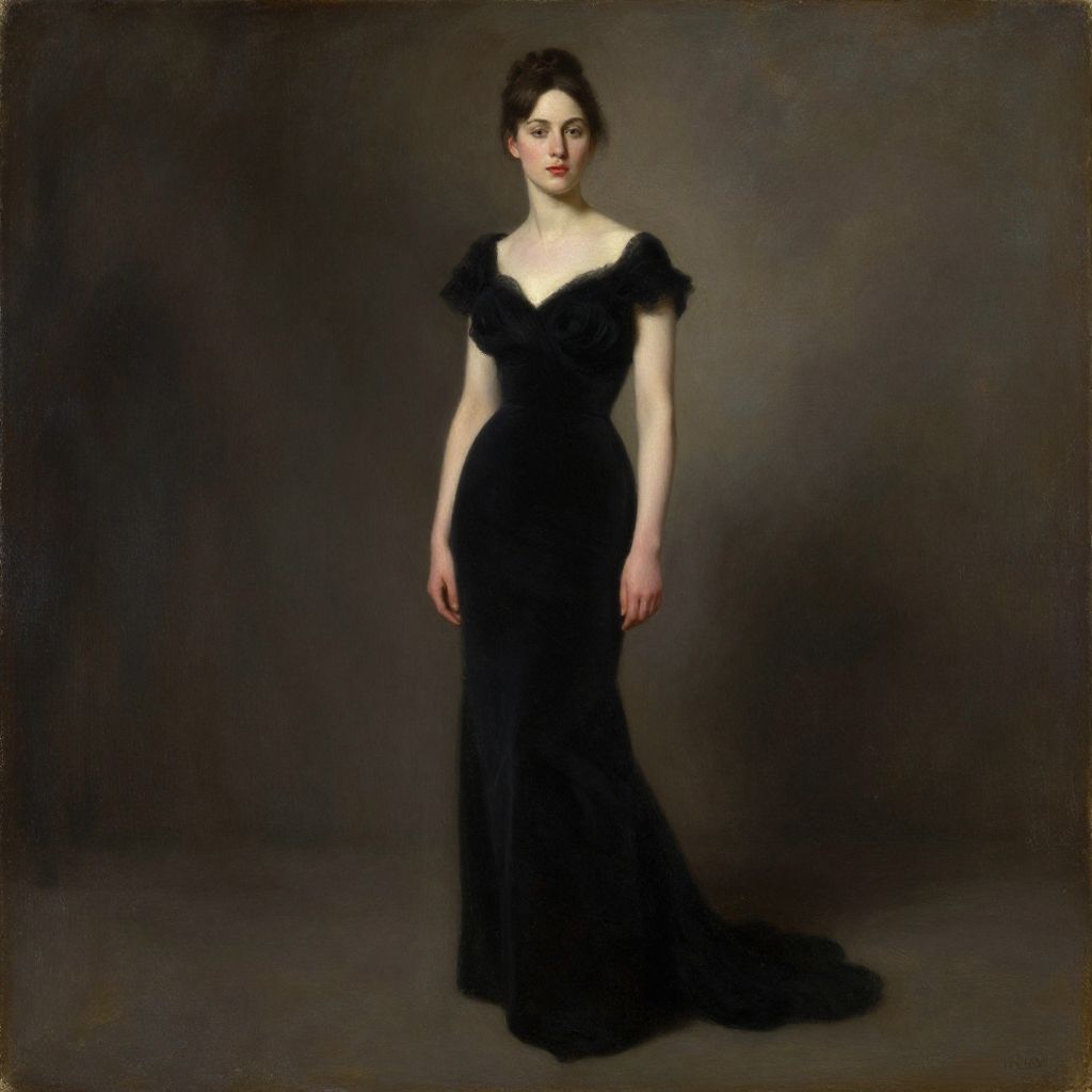 A photograph-like digital painting of a pale-skinned woman with dark brown hair styled in an updo, wearing a form-fitting, black, off-the-shoulder evening gown with delicate ruffles on the sleeves. She stands against a dark, gradient background, casting a subtle shadow on the floor. Her red lips contrast with her otherwise monochromatic attire, and her expression is neutral yet slightly melancholic. The texture of the gown appears soft and slightly sheer, adding an element of elegance and sophistication to the overall composition.