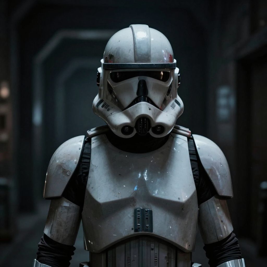 Photograph of a Stormtrooper from the Star Wars franchise, centered in a dark, blurred background. The Stormtrooper wears a glossy white, armor-plated helmet with a black visor and black markings, and a matching white chest plate with black straps. The armor is highly reflective, showing light highlights and shadow details. The figure's face is obscured by the helmet. The overall lighting is dim, with a blue tint, emphasizing the sleek, metallic texture of the Stormtrooper's armor. The image focuses on the upper torso and head of the Stormtrooper, capturing a sense of anonymity and uniformity.