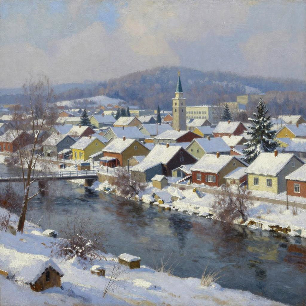 Photorealistic painting of a snowy village with colorful houses, a church steeple, and a river, under a cloudy sky.