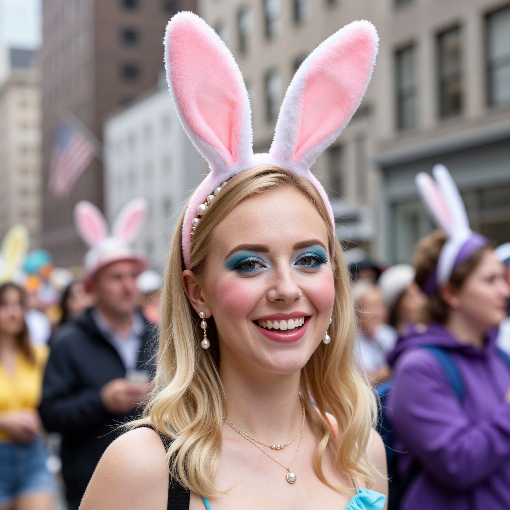 Blonde-haired woman smiling brightly while wearing a vibrant pink bunny headband adorned with pearls and pastel makeup, including blue eyeshadow and pink blush, as she participates in the colorful festivities of the Easter Parade and Easter Bonnet Festival in New York City during Spring 2019.
