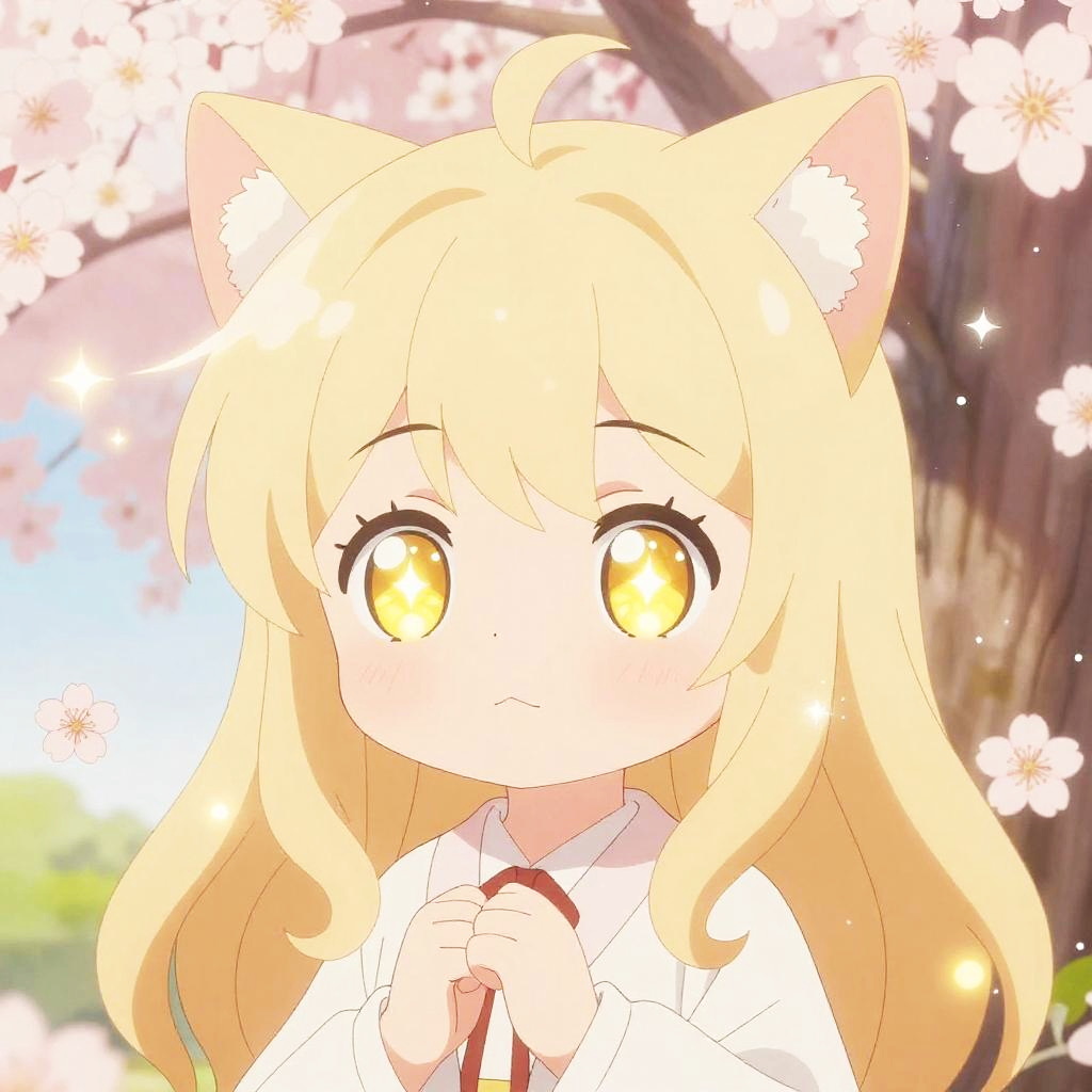 Uguu anime character in a pastel-colored fantasy setting, big sparkling eyes, cute cat ears, soft glowing lighting, surrounded by floating cherry blossoms and magical sparkles, whimsical and adorable atmosphere, highly detailed digital art