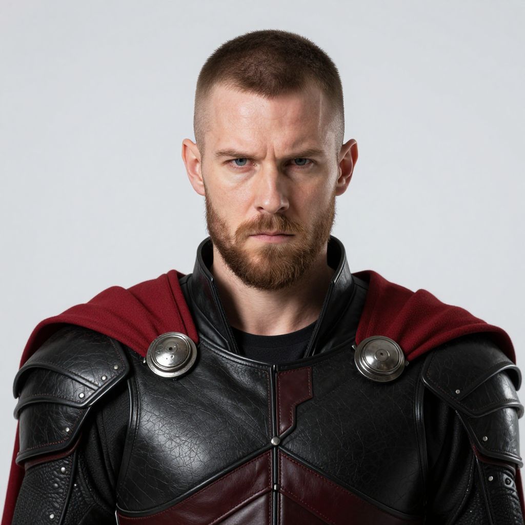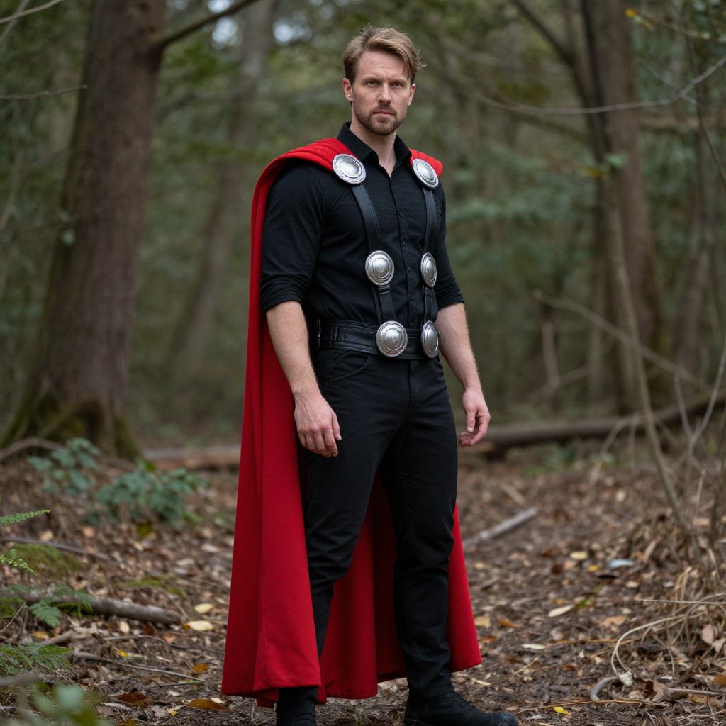 Thor Backpack Costume, man in a black shirt and red cape standing in the woods
