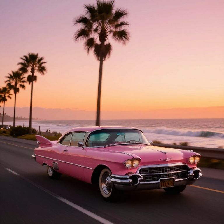Pink 1950s Cadillac driving down a coastal highway at sunset, ocean waves crashing nearby, palm trees swaying gently, warm orange and pink hues filling the sky, a sense of freedom and vintage road trip adventure
