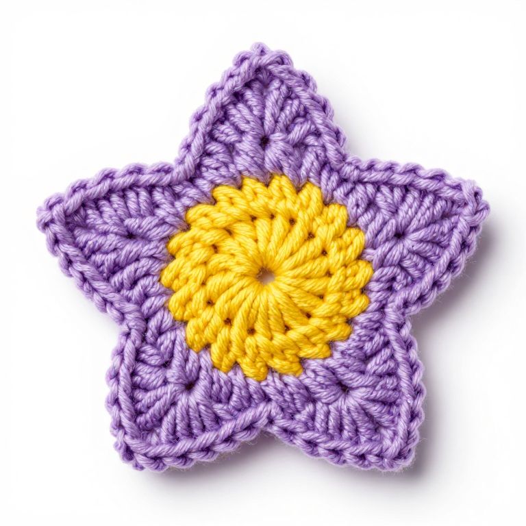 Handcrafted crochet star featuring a vibrant yellow circular center, intricately woven with soft lavender thread, showcasing detailed texture and symmetry against a clean white background.