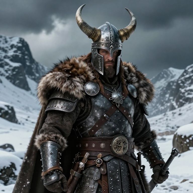 Digital artwork of a Viking warrior in ornate steel armor with horns, fur cloak, and snow-covered mountainous background under dark clouds.