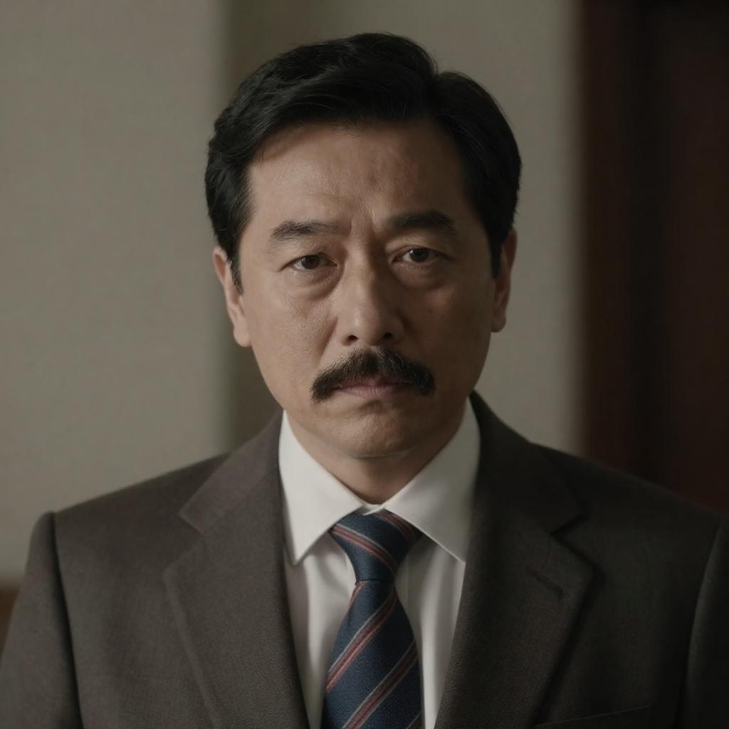Photograph of a middle-aged man with short black hair, wearing a dark blue suit and striped tie, sitting in a leather office chair. He holds a glass with a bloody hand, looking down with a serious expression. Sunlight filters through vertical blinds in the background.