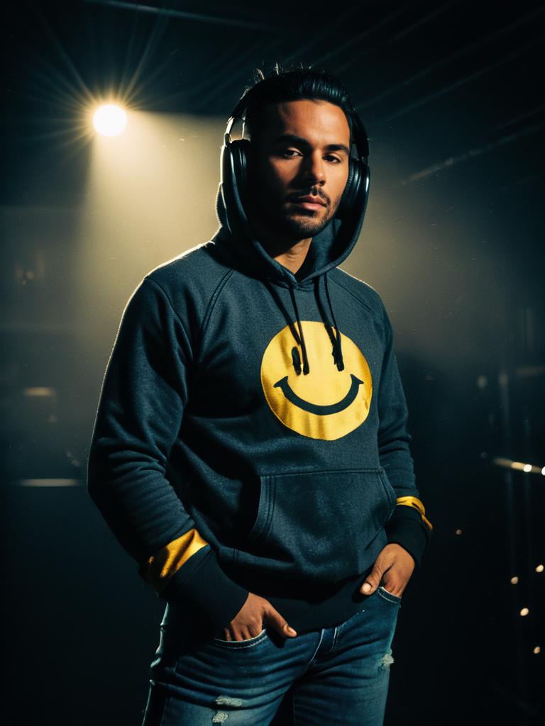 Portrait of a confident young man with medium skin tone wearing a grey hoodie with a large yellow smiley emoji graphic wearing headphones. The hoodie features drawstrings, long sleeves with yellow cuffs, and a fitted waistband. He is also wearing lightly distressed blue denim jeans with front pockets and a mid-rise waist with button closure. He has black over-ear headphones on and stands with his hands in his pockets against a dark, moody background with dramatic lighting.