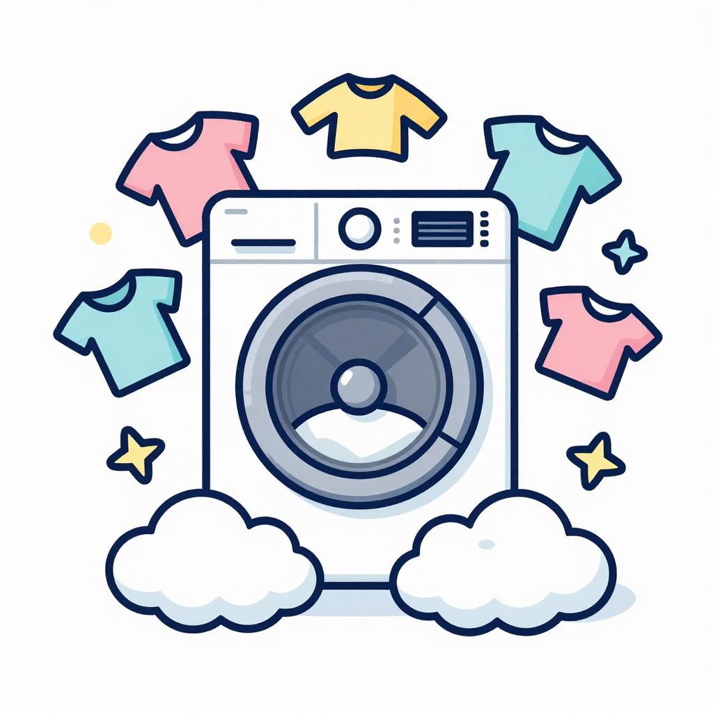 Cartoon-style digital drawing of a front-loading washing machine with a white rectangular body, grey circular door, and blue interior. Pink and blue T-shirt pieces and white stars float around it. The machine is outlined in black with simple, bold lines, and sits on fluffy white clouds. The background is plain white, emphasizing the colorful and playful elements. The overall style is whimsical and light-hearted.