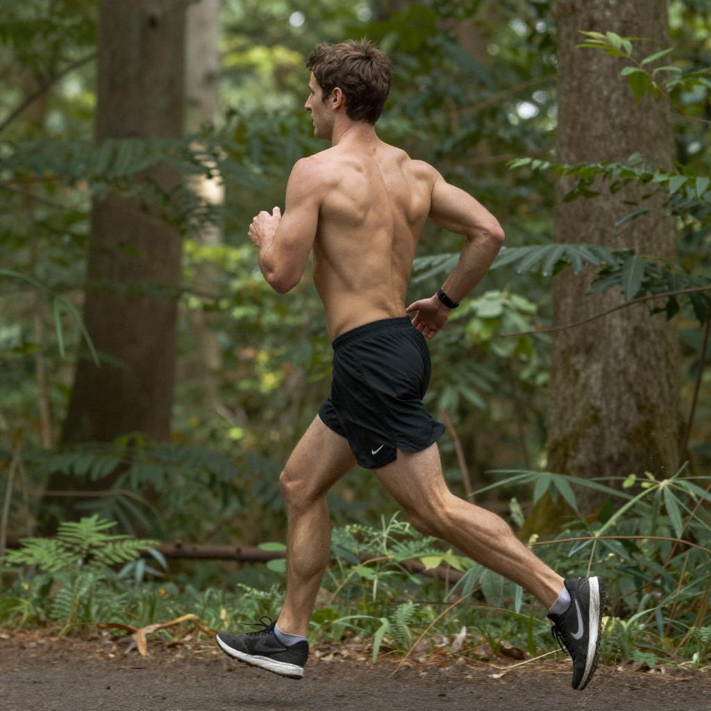 Photograph of a muscular, shirtless man jogging in a lush, green forest. He wears black shorts, black sneakers, and a watch, with