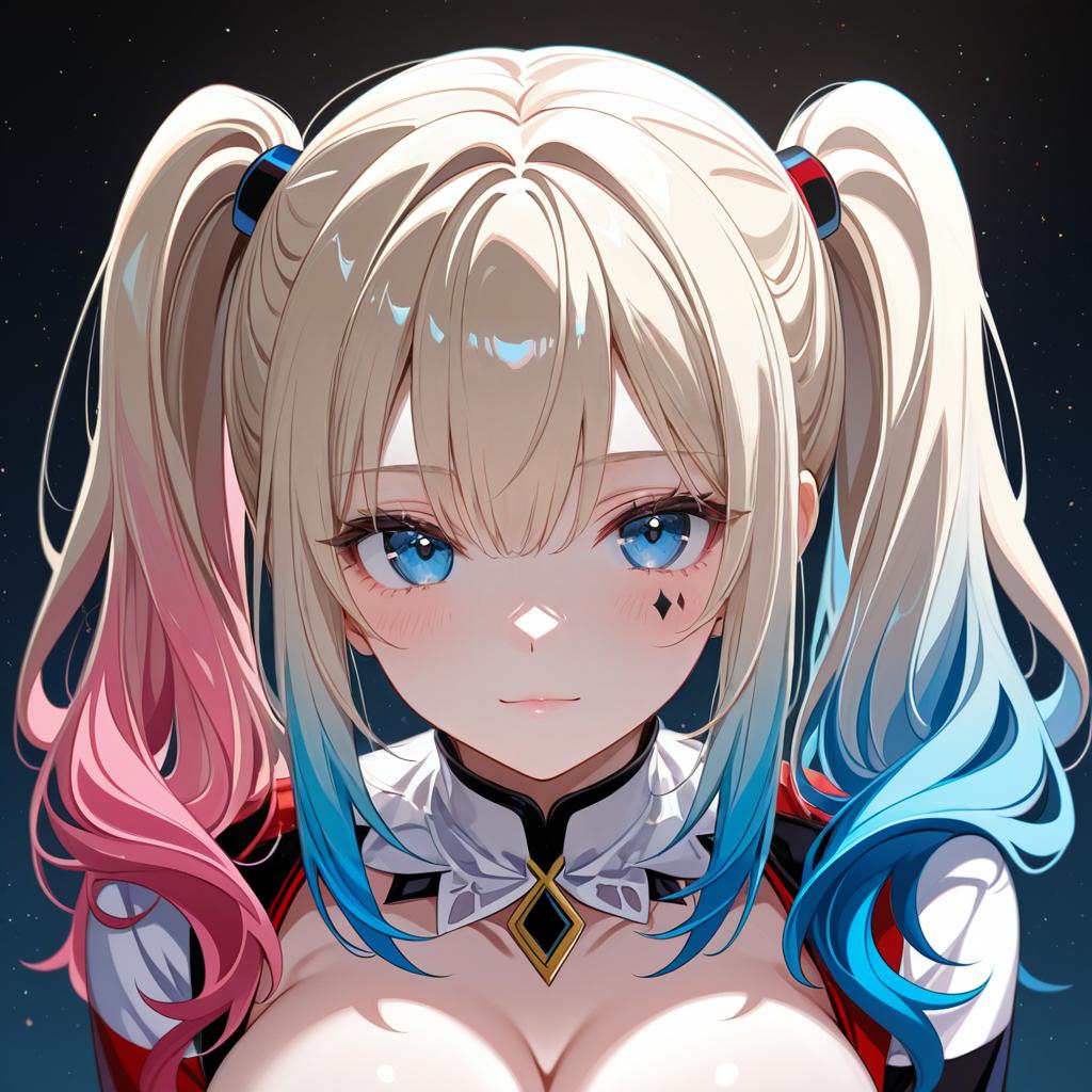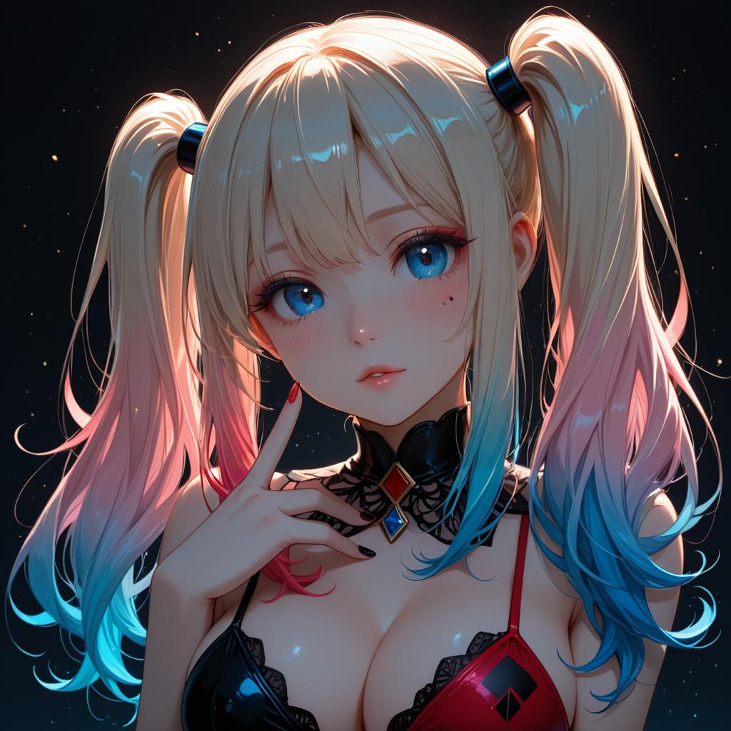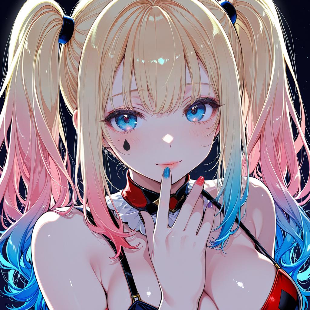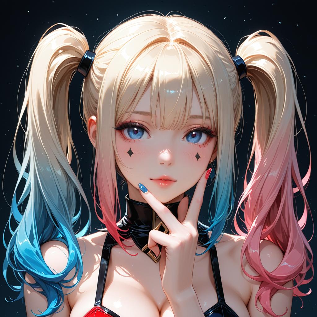 Harley quinn, dc comics, 1girl, red lips, blue eyes, blonde hair, blue hair, long hair, pink hair, gradient hair, twintails, large breasts, medium breasts, nail polish, lipstick, by artist sakiyo cake, dark_illustrious