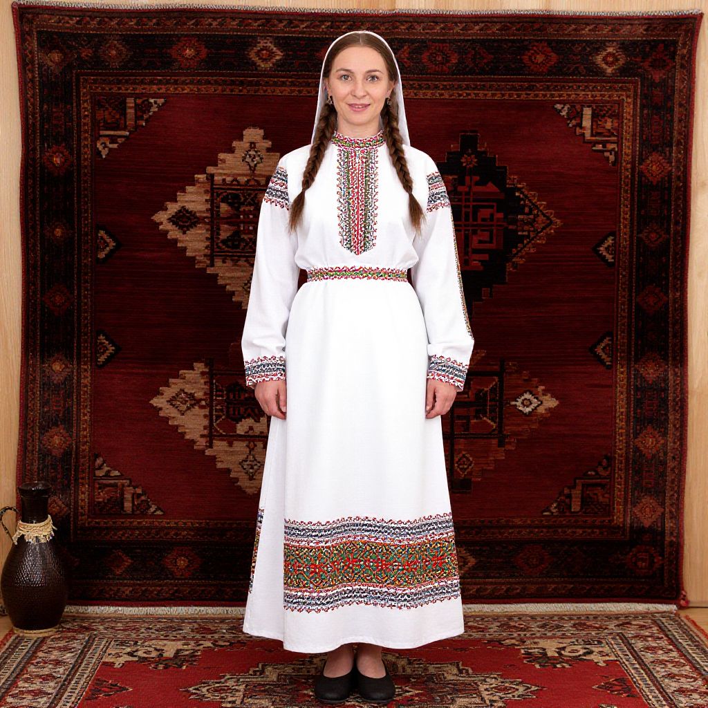 "Traditional Belarusian Dress, woman in traditional dress standing in front of a rug"