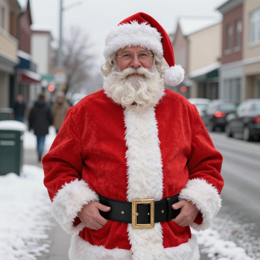 Santa costume man, photograph of an older man, Santa Claus, standing on a snowy urban street, daytime, red Santa suit with white fur trim, black belt with gold buckle, Santa hat with white fur, white beard, hands in pockets, street background with blurred buildings and trees, overcast lighting, realistic, winter season, medium shot, slight smile, casual pose, slightly chubby, middle-aged man, Christmas theme