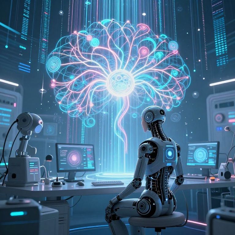 A digital CGI image depicting a futuristic, high-tech laboratory. A sleek, black humanoid robot with glowing blue accents sits on a white chair, facing a vibrant, neon blue and pink glowing tree-like structure centered on the back wall. The robot gazes at the structure with its head slightly tilted. Surrounding the robot are several white computer desks with monitors displaying various holographic and digital interfaces. The scene is illuminated by cool blue and white lights, enhancing the futuristic atmosphere. The background features vertical lines of light and technical equipment, adding to the high-tech, sci-fi ambiance.