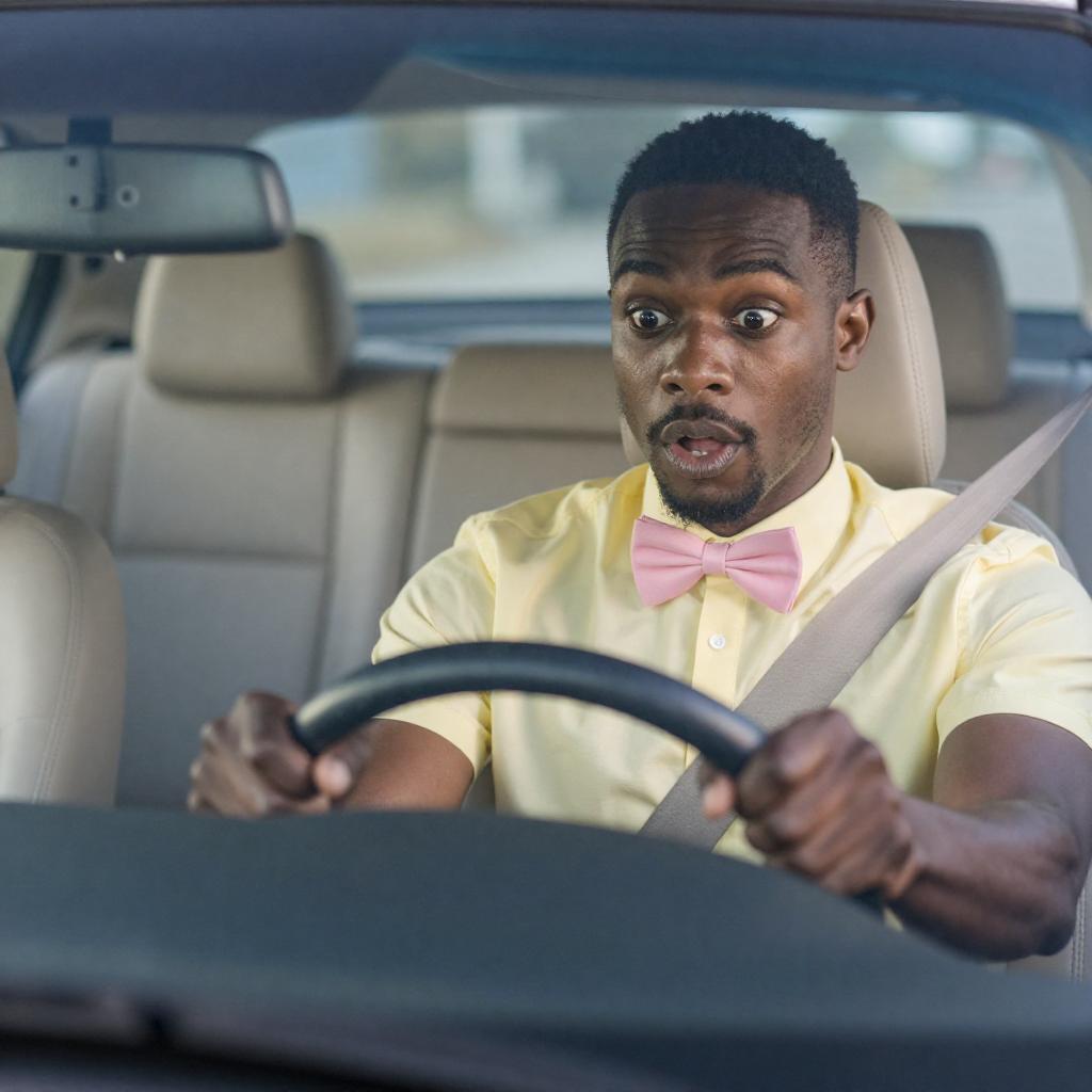 African-American man with short hair, yellow shirt, pink bow tie, driving a car, looking surprised, steering wheel in foreground, beige seat, blue car interior, partial view of another person's arm on left.