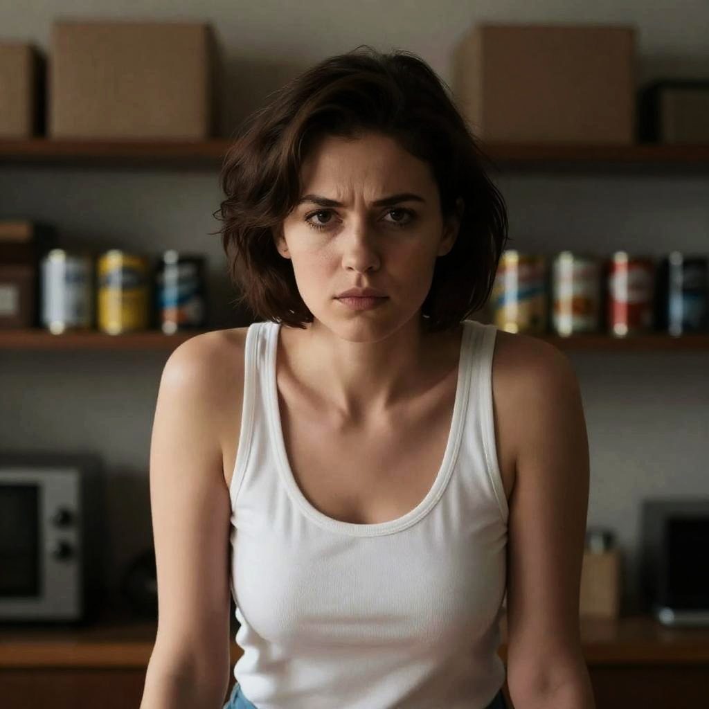 Photograph of a woman with short, messy brown hair, wearing a black sleeveless top, holding a glowing, fiery metal object in a dimly lit workshop. Blurred background. Intense focus on her face. Foreground object is blurred with bright flames.