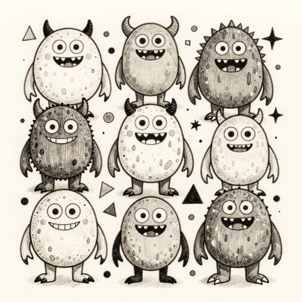 A detailed monster doodle art composition depicting an imaginative world filled with hand-drawn monsters possessing unique expressions, cartoonish bodies, and textured skin, all layered with overlapping doodles and fun geometric shapes on off-white paper.
