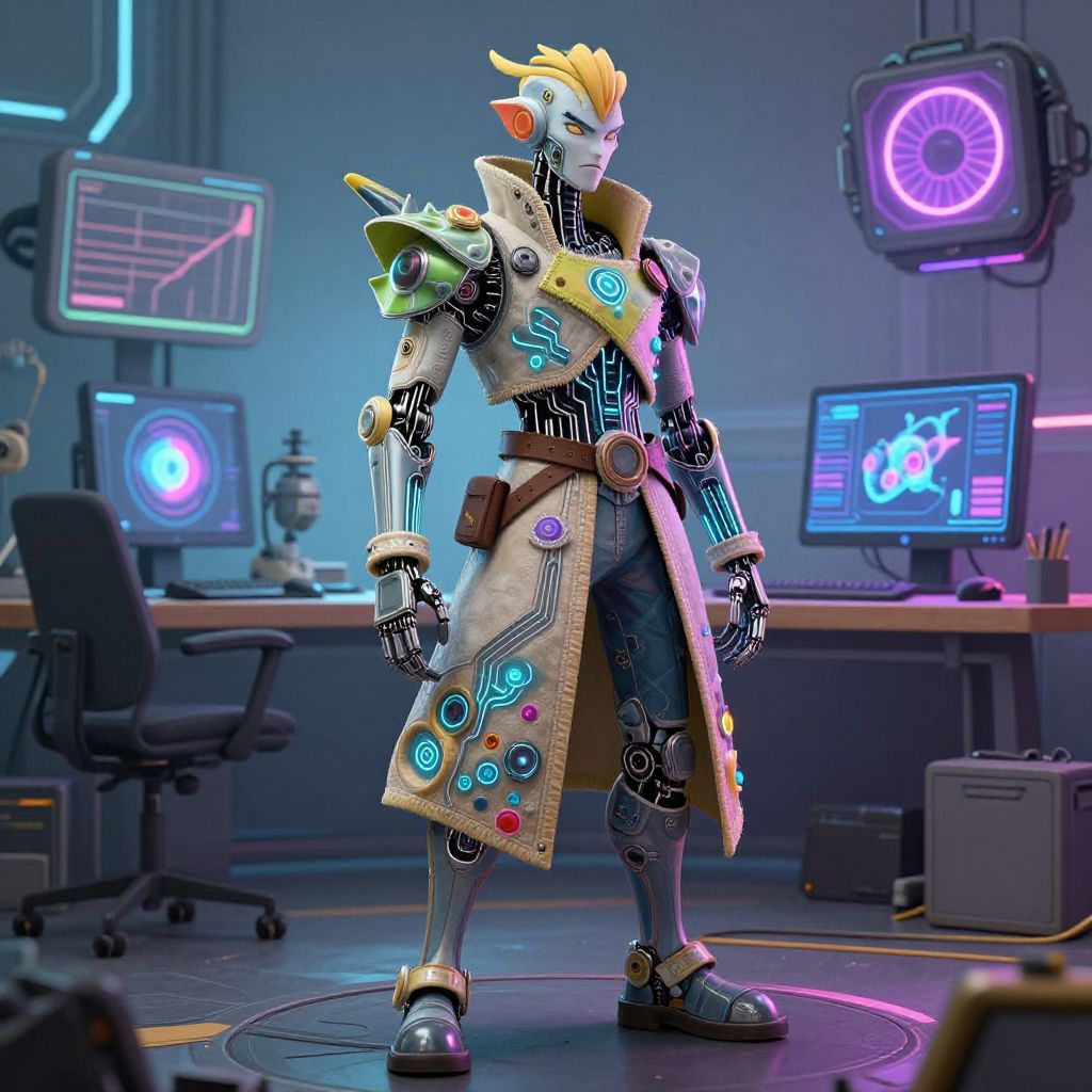 Character designer AI creating an original fantasy character, blending organic and robotic elements, detailed costume design with glowing circuits embedded in fabric, vibrant color palette with neon highlights, set against a virtual reality workspace filled with design tools and creative energy.