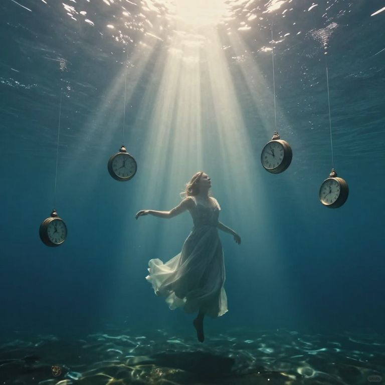 Under the ethereal glow of sunbeams piercing the depths, a haunting symphony of suspended clocks drifts through the lagoon, where time dissolves into a surreal dance of serenity and existential contemplation.