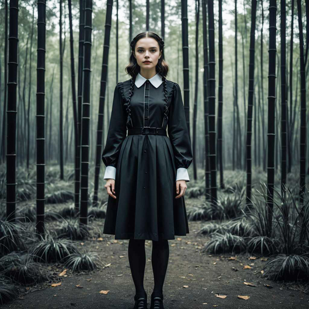 Woman in Wednesday Addams Inspired Dress in Bamboo Forest