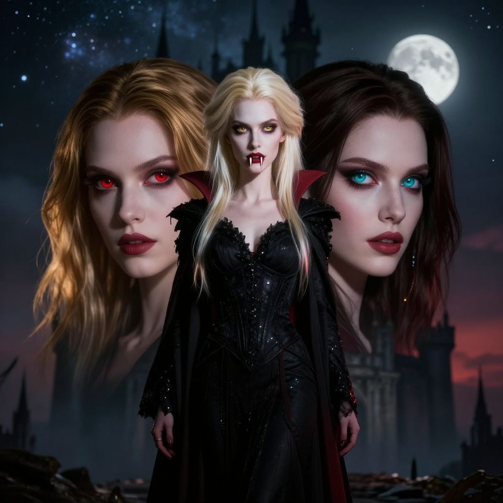 A digital CGI image featuring a central female vampire with pale skin, long blonde hair, and red eyes, wearing a black, frilled, gothic dress. She stands in front of three larger, semi-transparent headshots of herself, one with red eyes, one with blue eyes, and one with black hair and blue eyes. The background shows a dark, starry night sky with a full moon and a gothic castle. The overall style is dark and eerie, with high contrast and dramatic lighting. The vampire's pointed ears and fangs add to the menacing appearance.