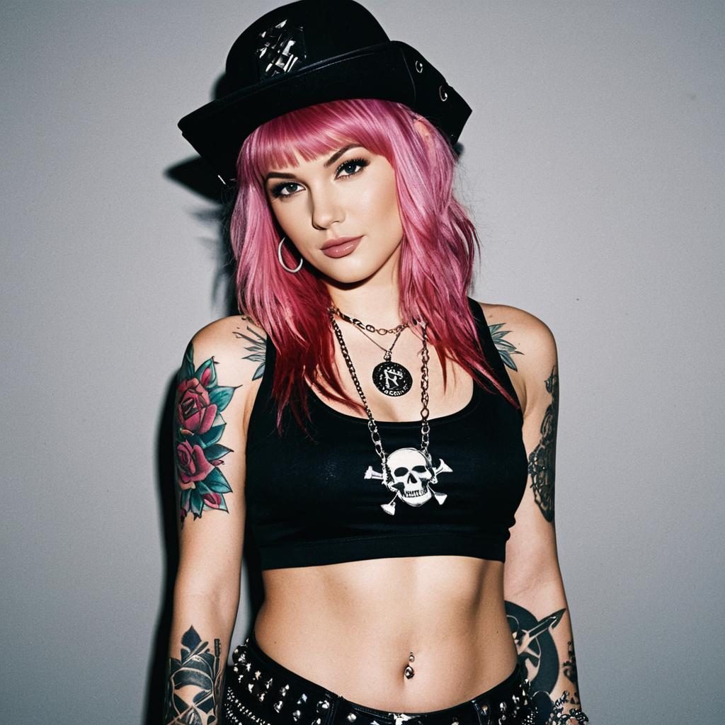 Portrait of a woman with neon purple hair styled up and bangs, wearing a strapless purple satin dress. She accessorizes with matching purple gemstone earrings and a necklace. Her makeup features bold purple lipstick and defined eyes against a dark background.