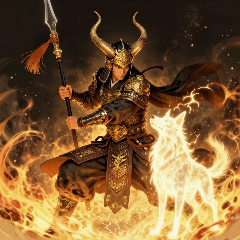 Digital artwork of a traditional Eastern warrior in ornate golden-patterned armor, wearing a horned helmet and holding a halberd with a tassel. The warrior stands in a dynamic, battle-ready pose surrounded by flames, accompanied by a glowing spectral dog emitting a mystic aura. The detailed armor and powerful stance convey nobility and ancient mystery with a strong magical and spiritual atmosphere.