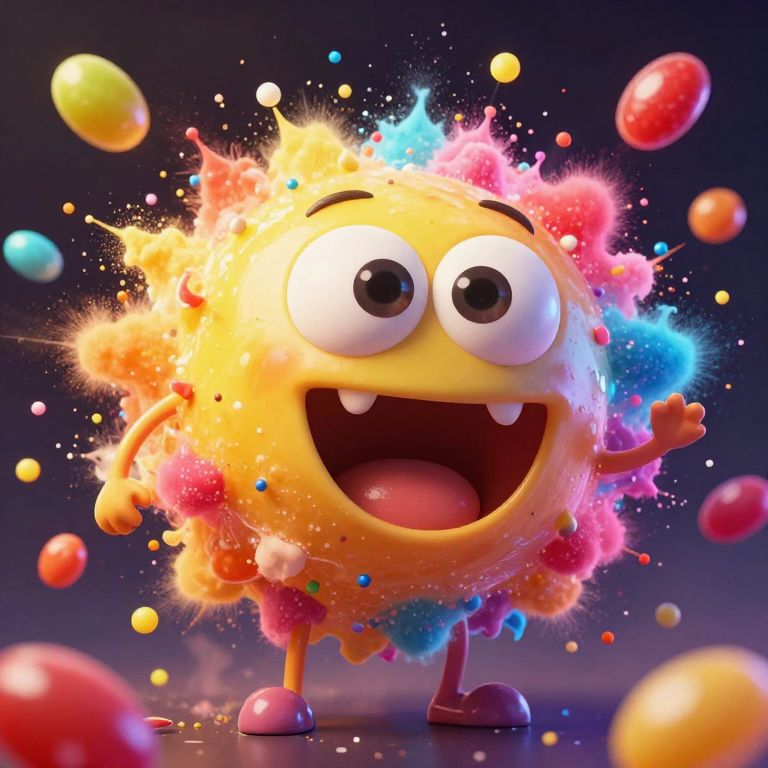 A colorful, exploding jellybean monster with wide eyes and an open mouth, surrounded by flying candies and a burst of colorful dust.
