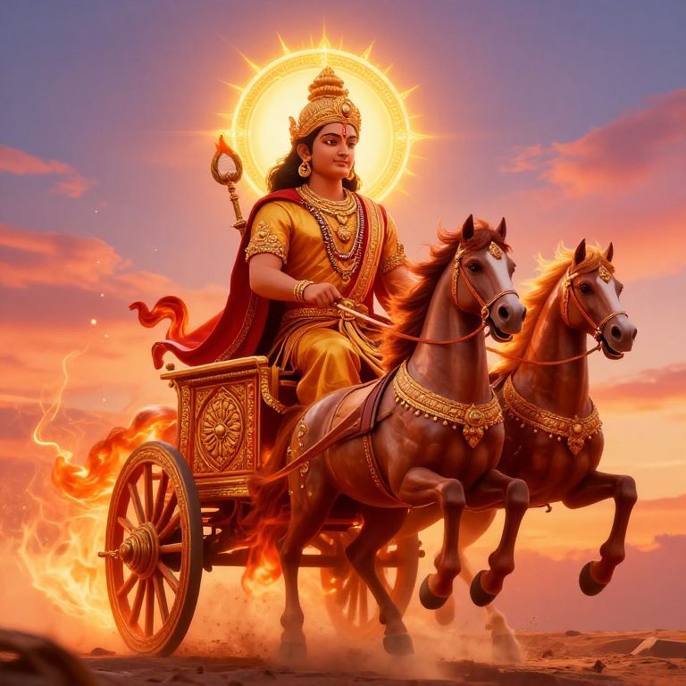 Surya, the radiant sun god, depicted as a majestic figure with a golden halo, riding a chariot drawn by fiery horses across a vibrant sky at dawn, detailed with intricate traditional Indian motifs and glowing light effects.