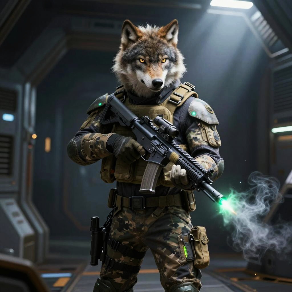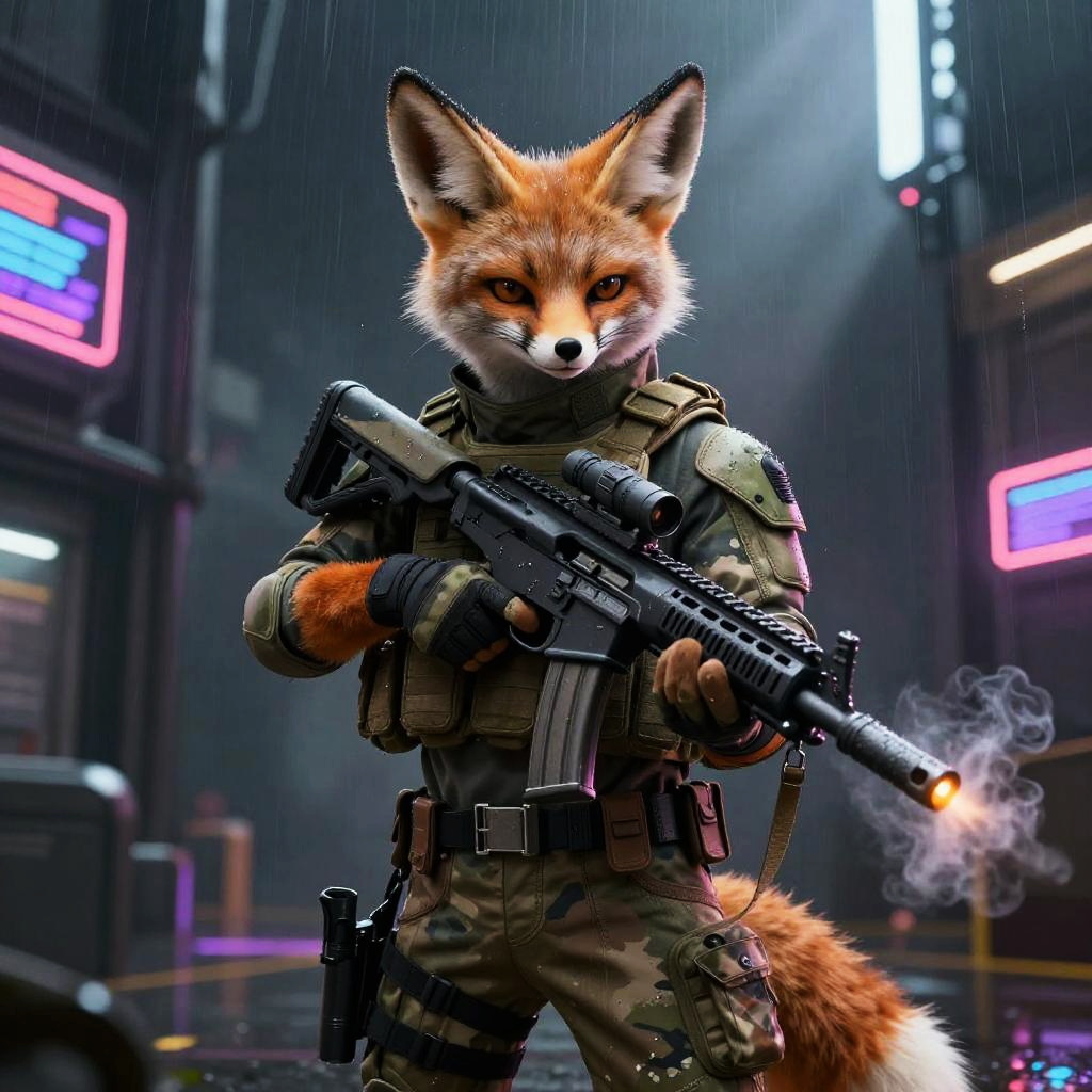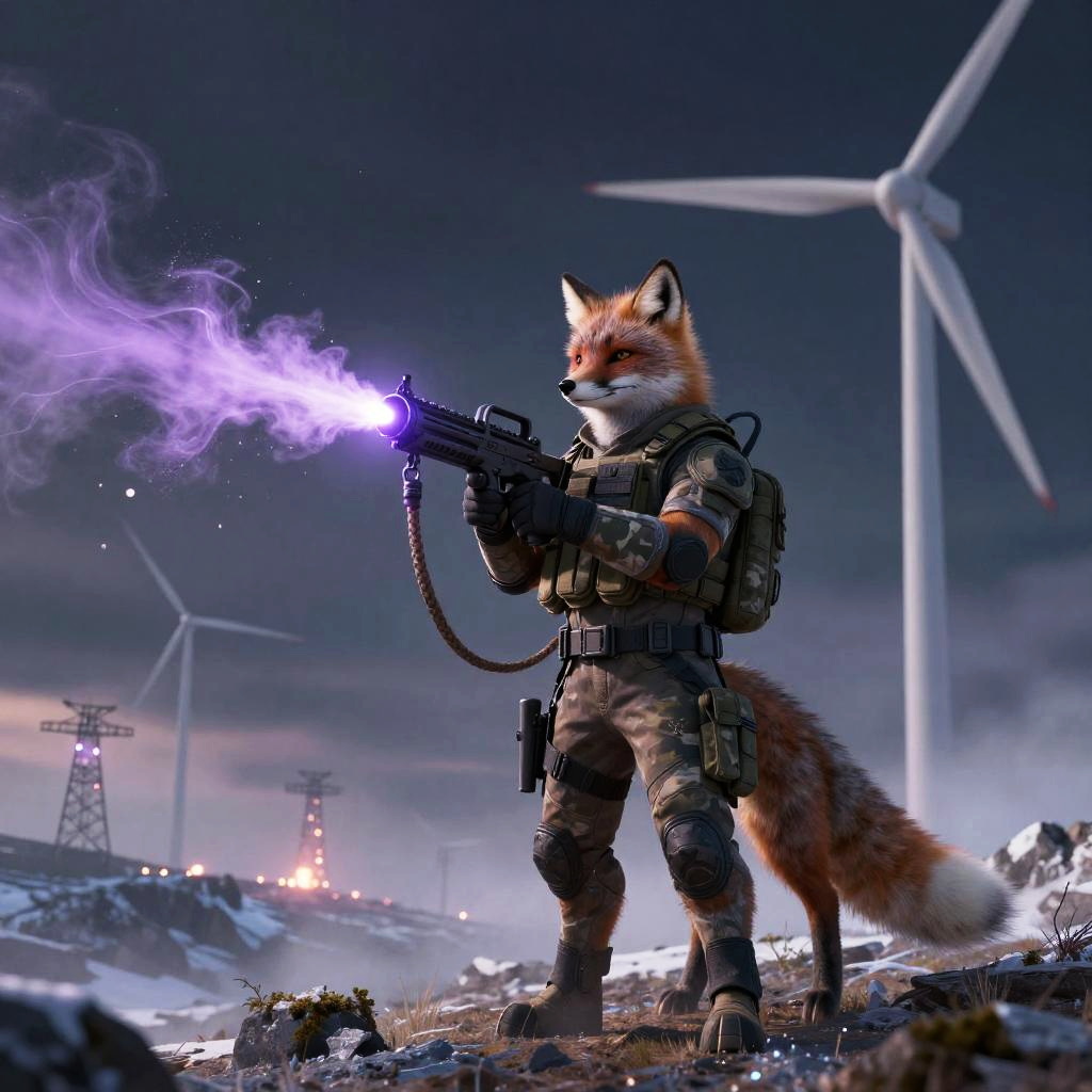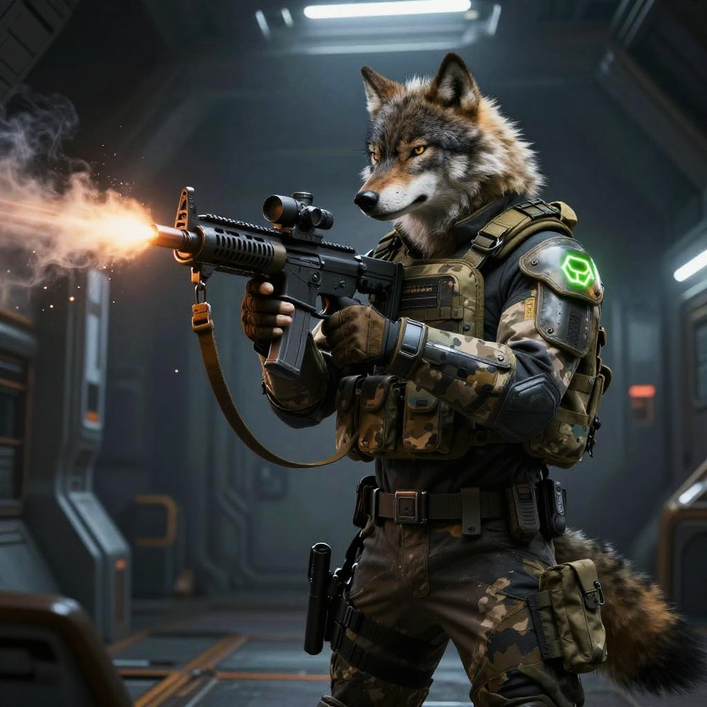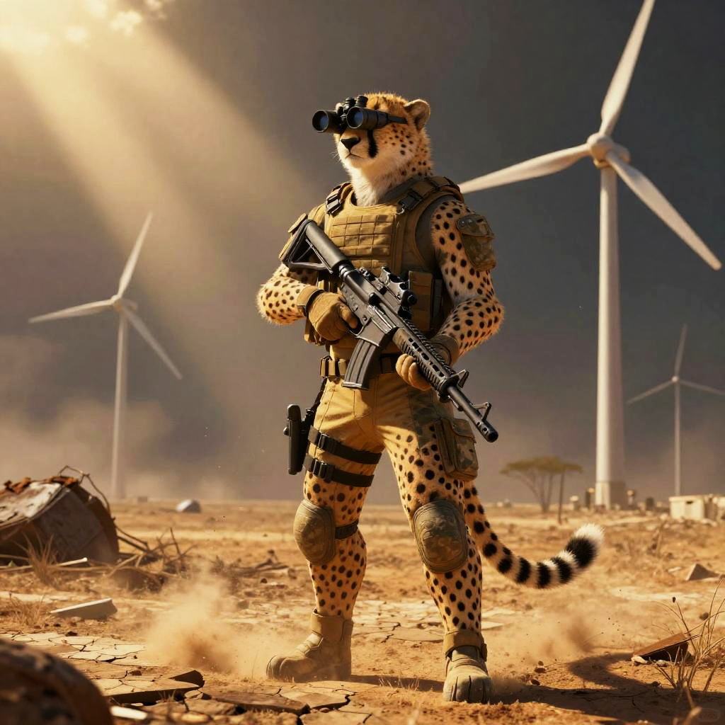 Absurdres, (realistic:1.5), (masterpiece, Extremely detailed CG unity 8k wallpaper, best quality, highres:1.2), (ultra_detailed, UHD:1.2), perfect illumination, rim lighting, sidelighting, volumetric fog, god rays, (dark background:1.3), (savannah cheetah recon commando (lean spotted fur, desert-tan sprint-optimized tactical skinsuit, rangefinder visor, lightweight aerodynamic load-bearing vest, athletic build):1.4), (furry:1.1), animal, solo, standing, tactical armor, gloves, load bearing vest, pouches, holster, camouflage accents, sun-baked abandoned windfarm on cracked savannah plains at golden hour with dust motes, broken turbine blades, wavering heat shimmer, shafts of god rays and low dusty fog, holding, weapon, gun, suppressed lightweight long-barreled compact DMR-PDW hybrid with warm golden muzzle glow, low-profile scope, folded bipod, tactical sling and faint dust plume, sling, muzzle smoke, cinematic DOF, particles, unreal engine, (no humans:1.2), blurry background