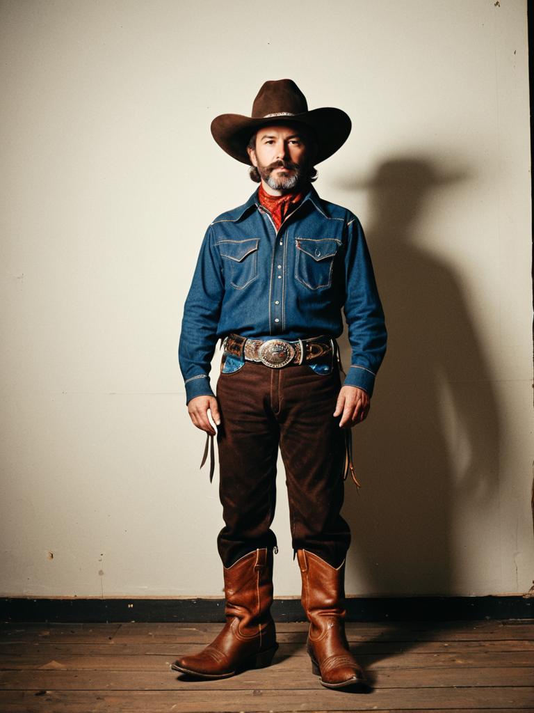 A middle-aged man standing in full view wearing an old-fashioned cowboy costume. He has a brown cowboy hat, denim long-sleeve shirt, red bandana around his neck, brown pants, detailed belt with large buckle, and brown cowboy boots. The man has a mustache and beard with some gray, and he is looking directly at the camera against a plain wall background with wooden floor.