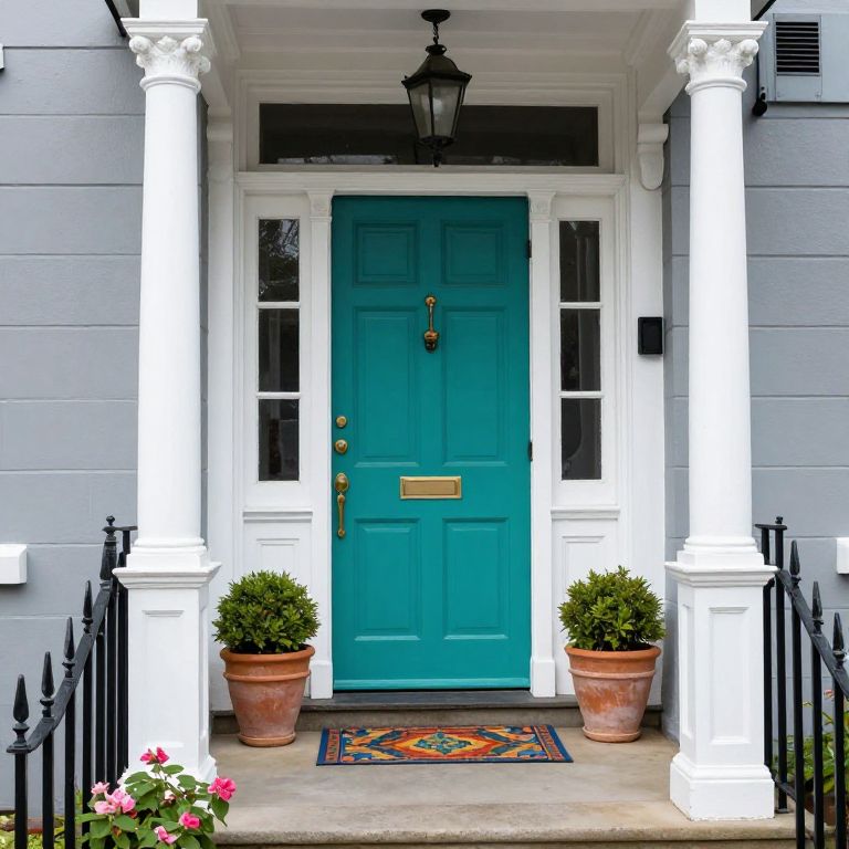 Victorian-style porch featuring a vibrant teal front door flanked by white columns, a black lantern sconce, and two colorful doormats on the steps, complemented by potted plants and pink flowers in the foreground.