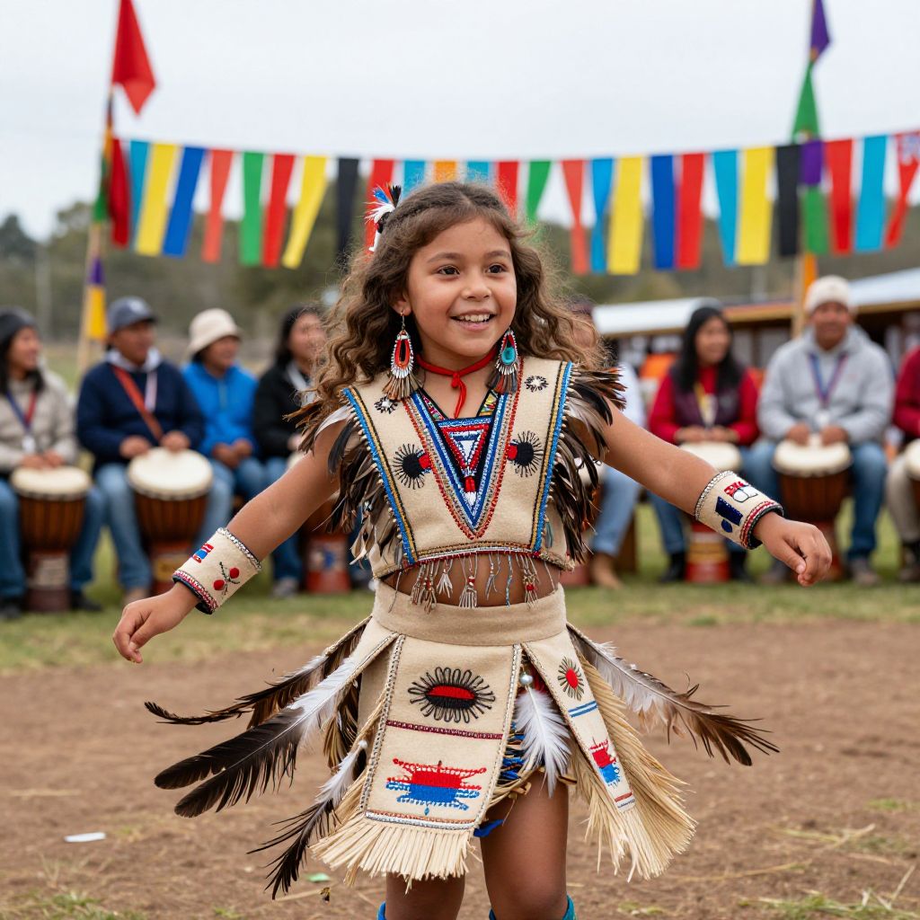 A lively Indigenous girl with bright eyes, curly brown hair, and a joyful expression, wearing a detailed traditional indigenous costume made of natural fibers, feathers, and symbolic embroidery, dancing in a vibrant open-air festival in a rural Native community with colorful banners and drumming in the background.