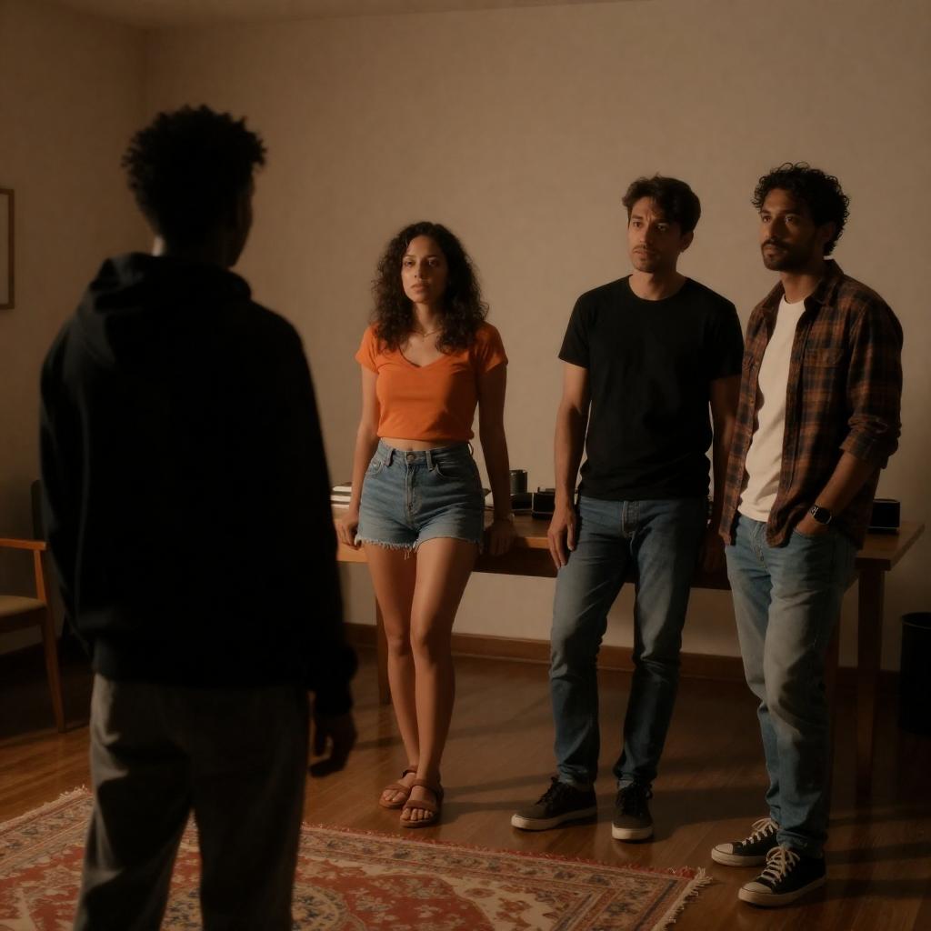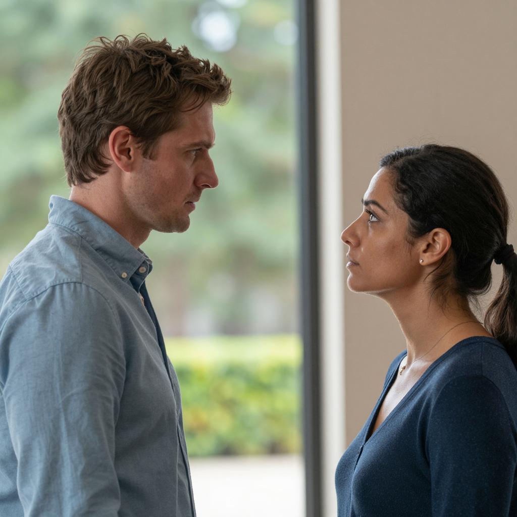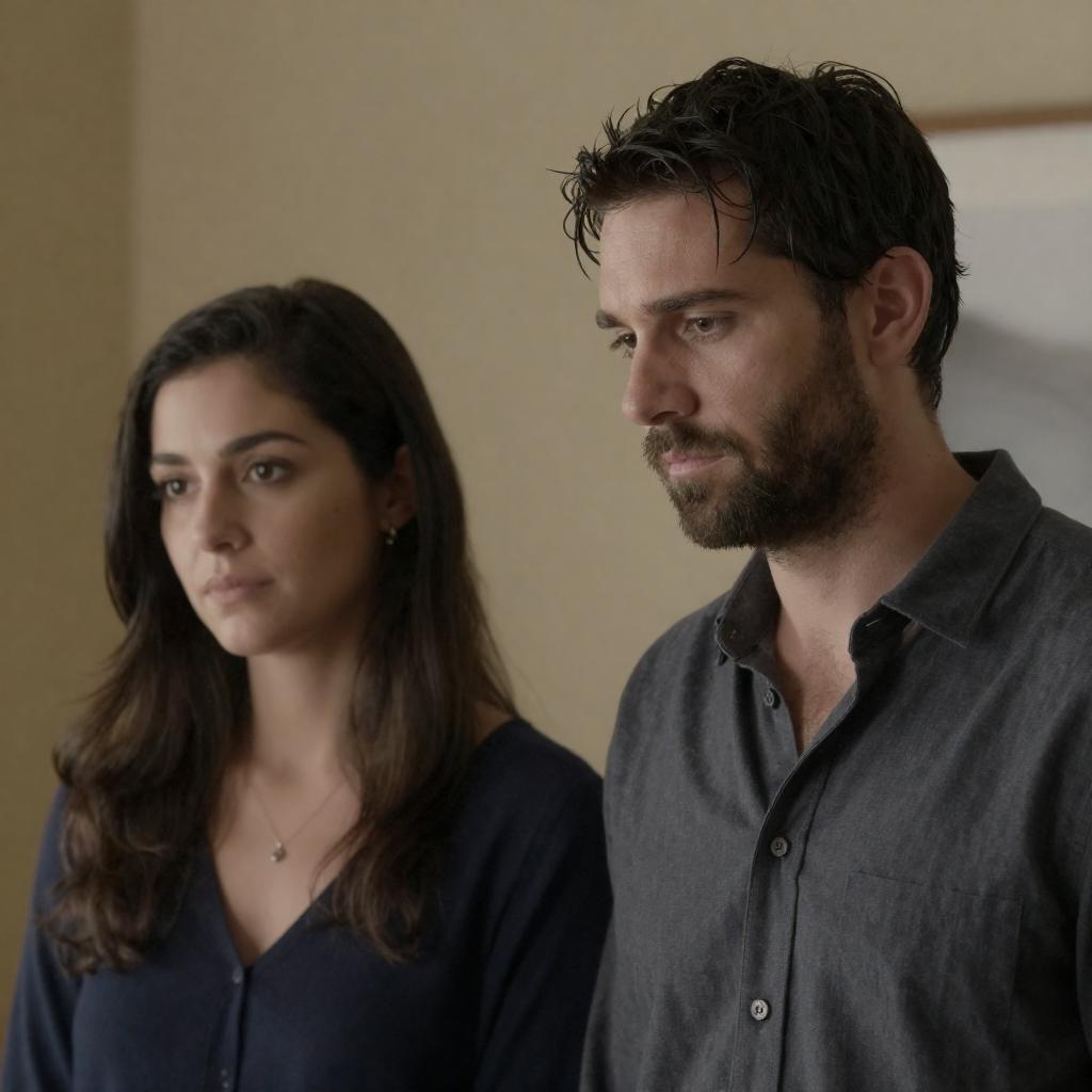 A man and woman stand facing each other indoors near a green wall with a floral curtain. The man has short curly brown hair, wears a gray long-sleeve shirt, and is seen in right profile. The woman with black hair wears a blue top with green stripes and is shown in left profile. They are looking at a black-framed collage of multiple photographs. The room features a green wall and the atmosphere is neutral and focused.