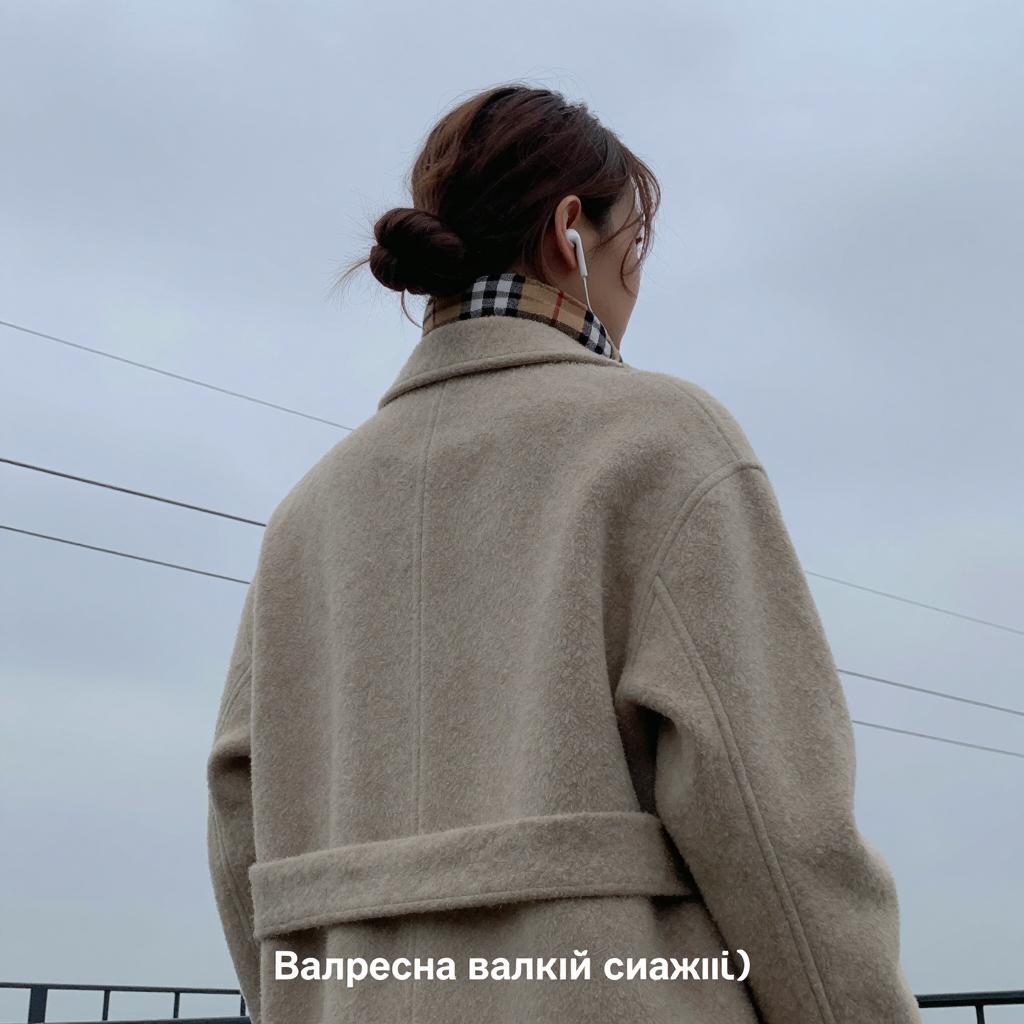Photograph of a person from the side, wearing a beige, ured coat and a checkered scarf, with brown hair in a bun. They have white earbuds in both ears. Overcast sky in the background with power lines. Text at the bottom in Russian. Person's face not visible.
